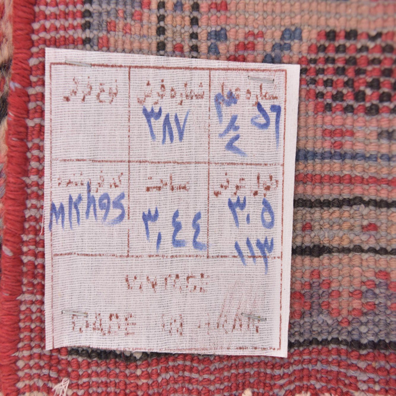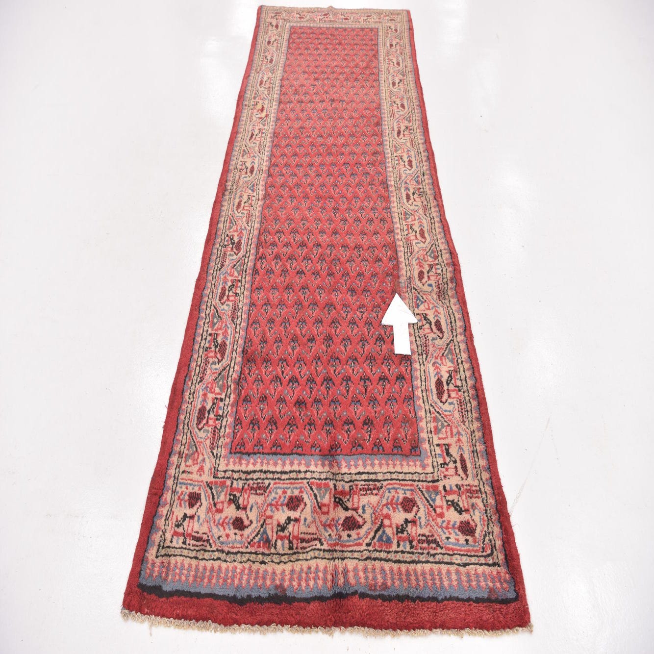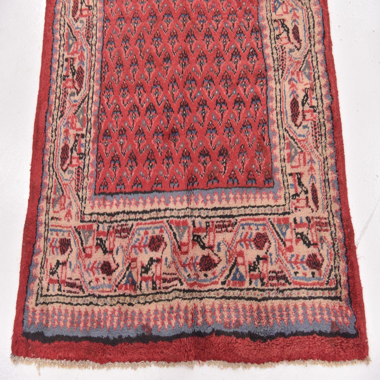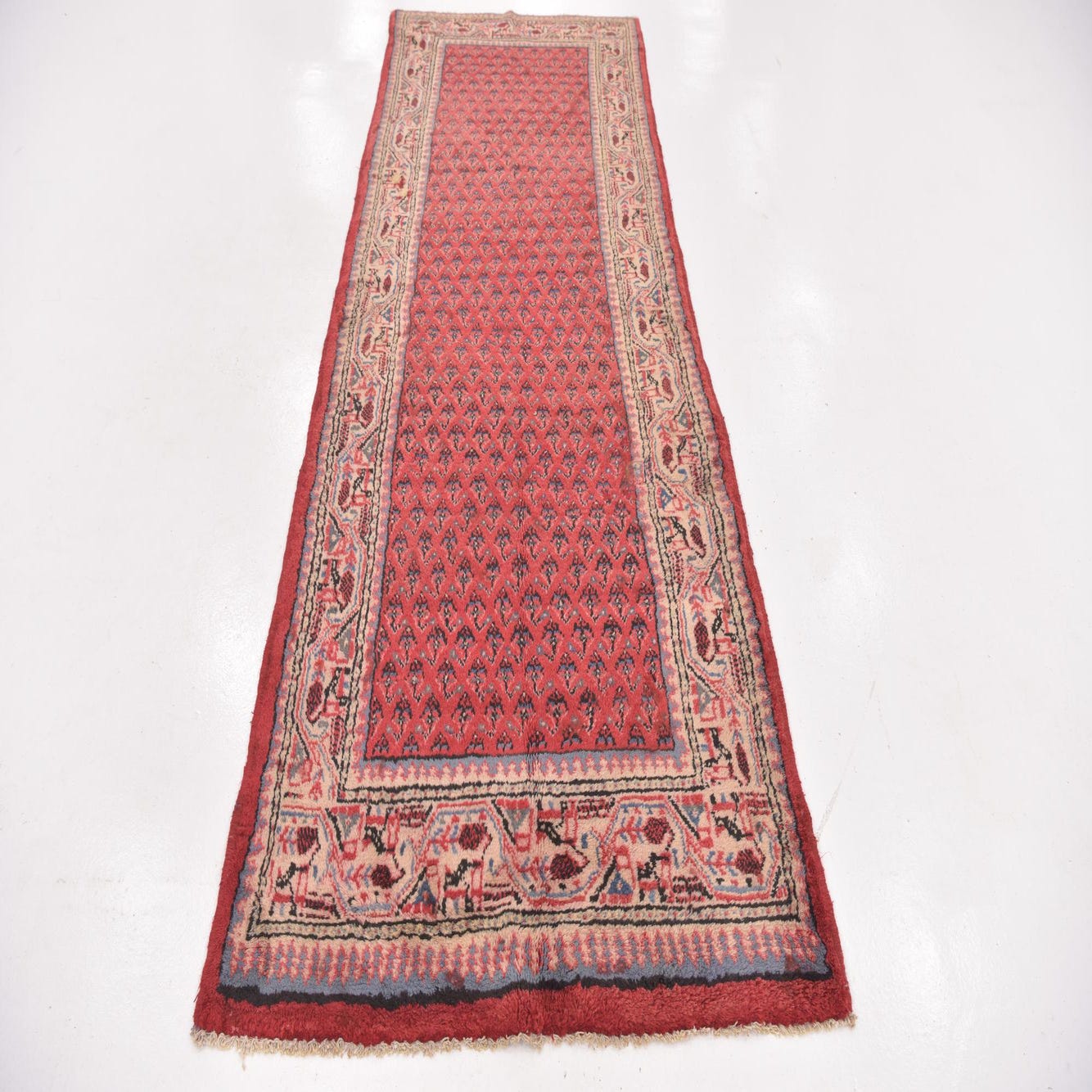 A 10 Ft Botemir runner rug in rich red with a traditional Persian tribal pattern and an intricate border.