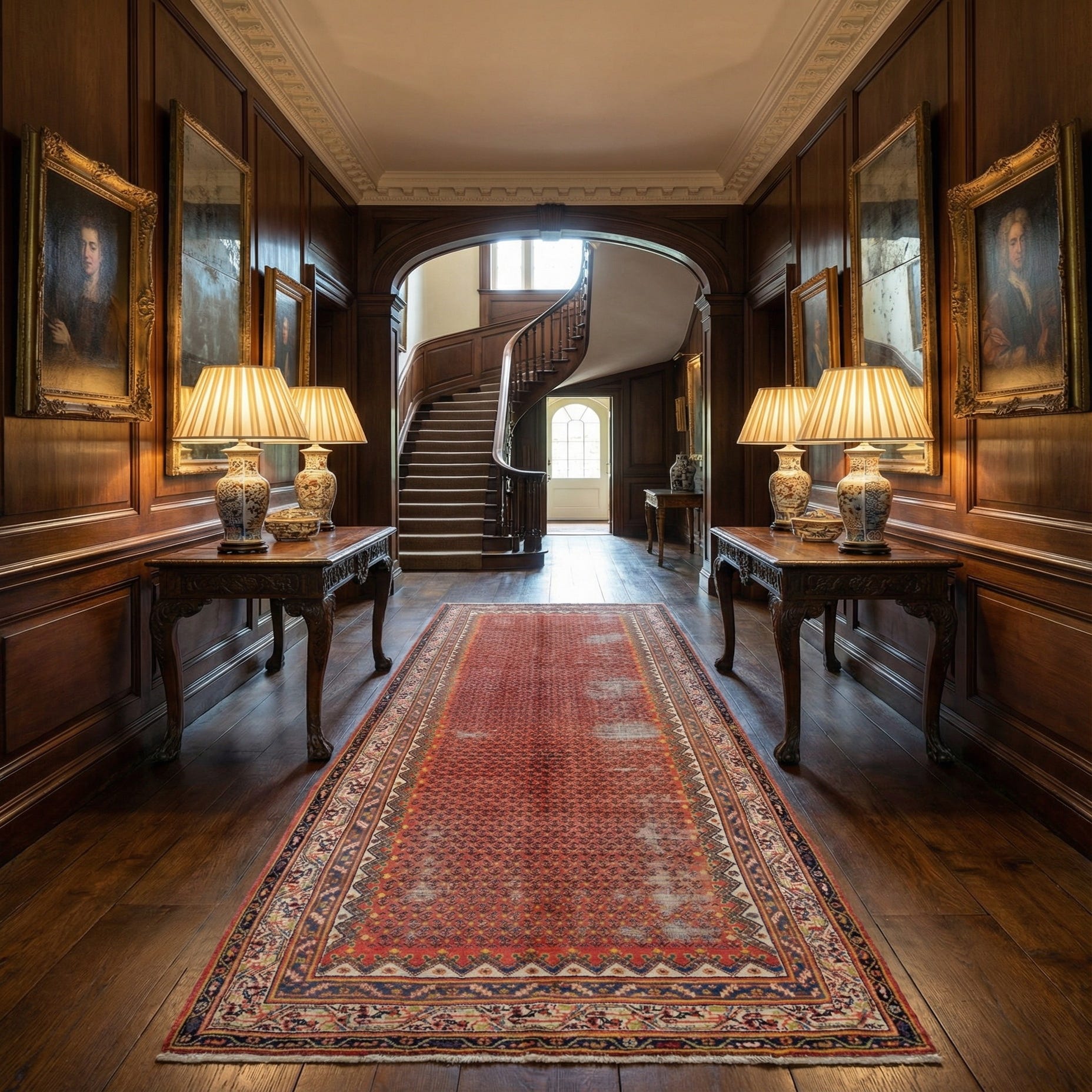 A 10 ft red Persian runner rug with intricate traditional patterns and a multi-bordered design, suitable for a hallway.