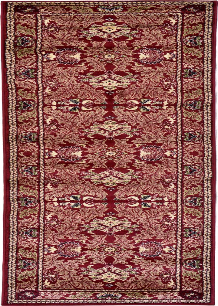 Primary color is Red. Colors in this rug include: Red, Cream, Black, Red, Green.