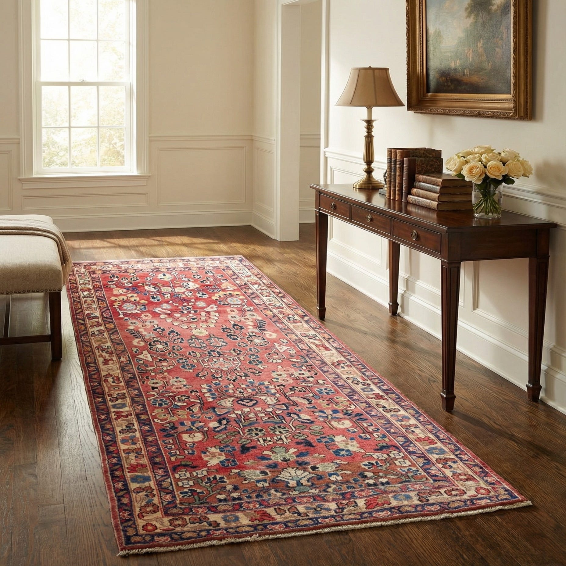 A 10 ft red Farahan runner rug with traditional botanical and tribal floral patterns in blue, cream, and gold, ideal for a hallway.