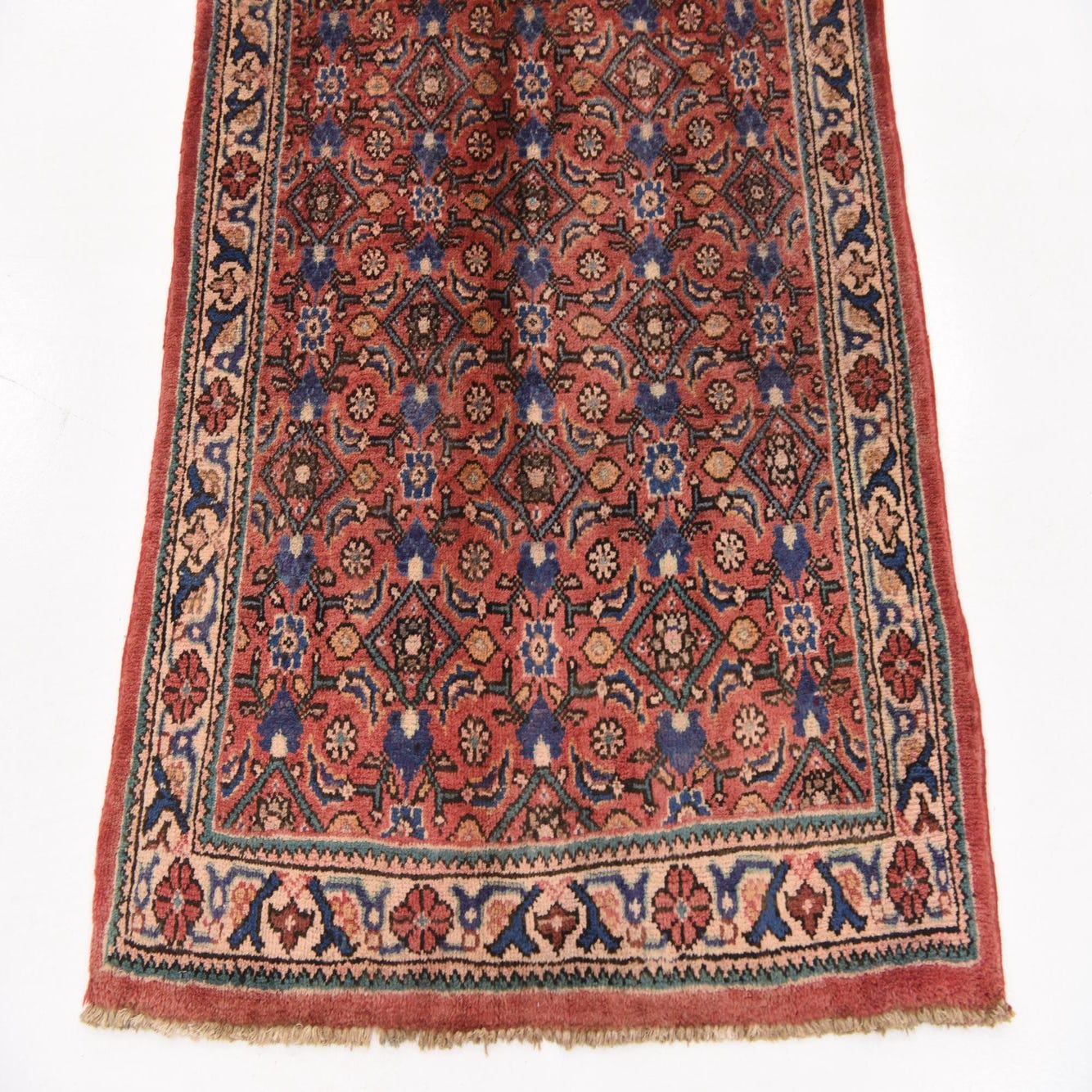 This piece would complement traditional and classic interiors, serving as a sophisticated runner in hallways or a rich accent in living spaces where its length can be appreciated. Its color scheme and pattern would also make it a fitting choice for eclectic decors, where it could add warmth and a touch of the artisan to a thoughtfully curated room. The Farahan runner's timeless nature ensures its adaptability to various spaces looking to integrate elements of heritage and quality.