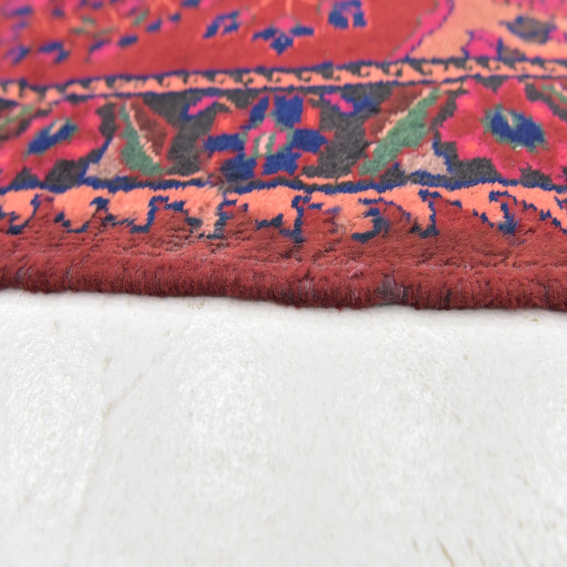 This Ferdos Collection rug brings traditional elegance to any space with its authentic design. Handmade from 100% wool, this 10 Ft runner boasts a rich red background, providing a warm and inviting base for the intricate patterns that adorn it. The palette is vibrant and diverse, incorporating shades of beige, black, green, navy blue, orange, and pink for a complex visual texture that demands attention.