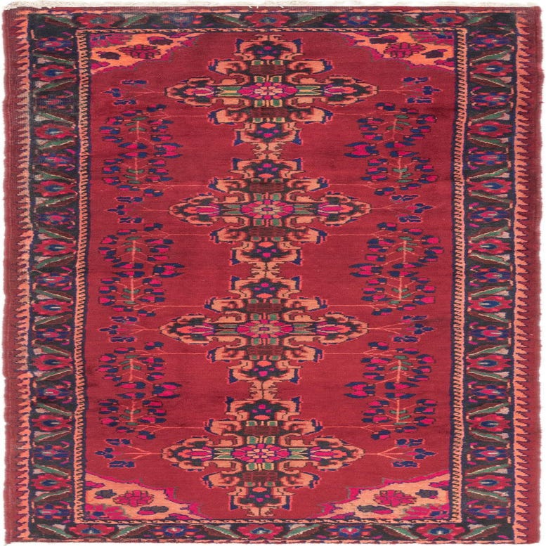 Primary color is Red. Colors in this rug include: Red, Beige, Black, Green, Navy Blue, Orange, Pink.