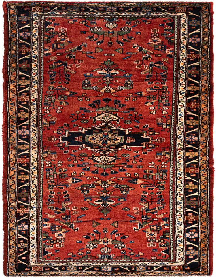 Primary color is Red. Colors in this rug include: Red, Cream, Brown, Green, Blue.