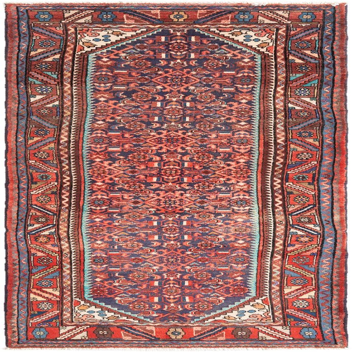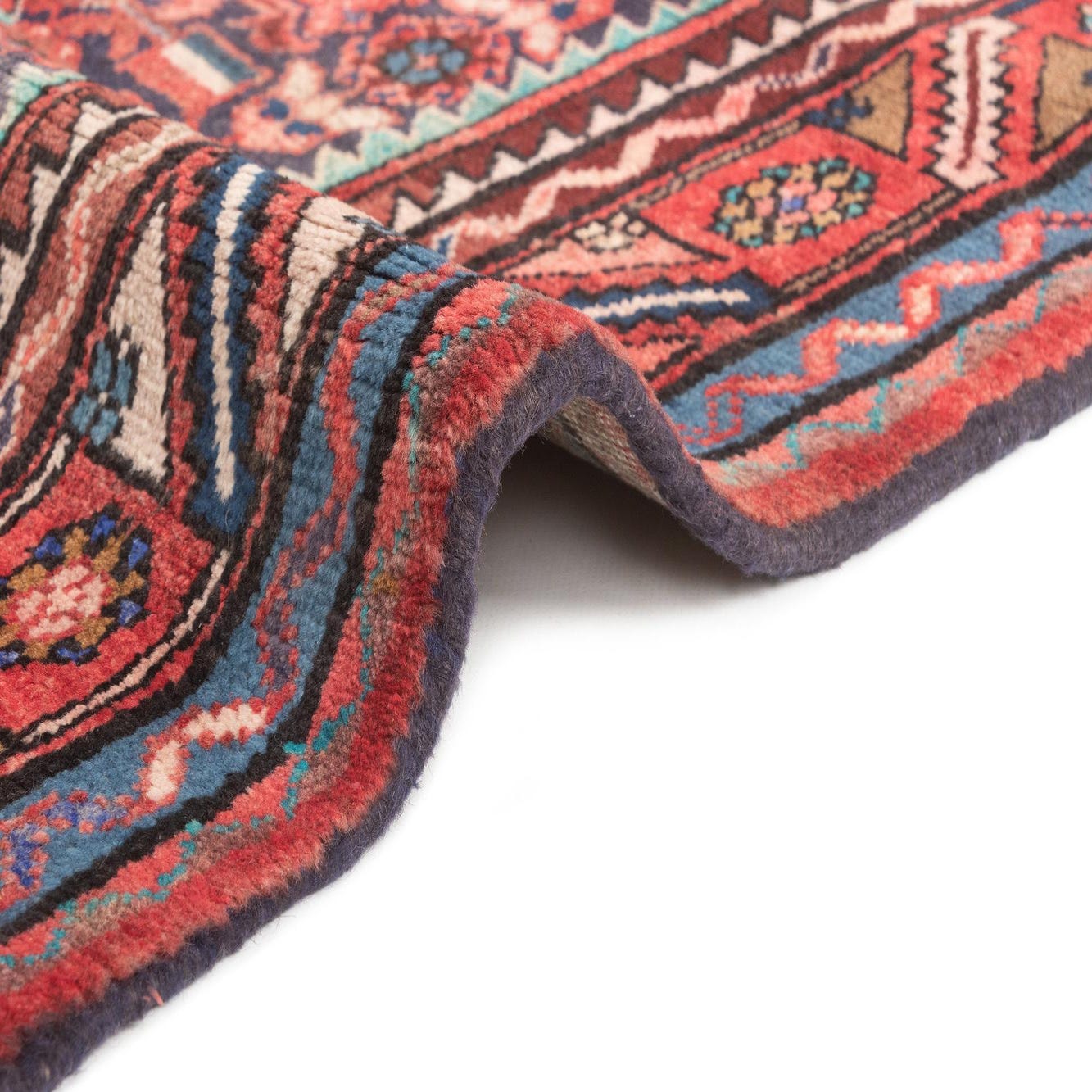 The Hamedan collection presents a handcrafted wool 10-foot runner that showcases a vibrant and intricate design, ideal for adorning a long corridor or entryway. The predominant red background is adorned with a diverse palette of colors, including blue, dark blue, cream, and brown, which contribute to the depth and richness of the pattern. The ornate geometric and botanical motifs are symmetrically arranged, offering a sense of balance and traditional sophistication.