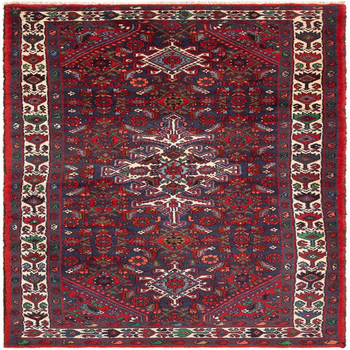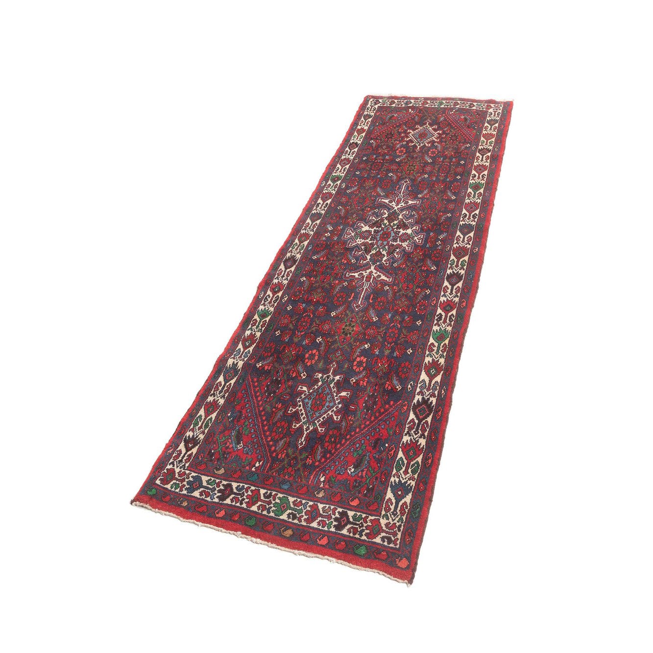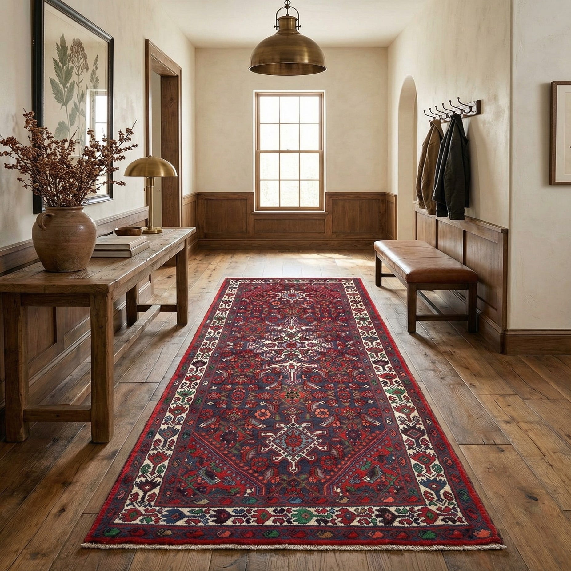 A 10 ft Hamedan runner rug in deep red and navy blue with intricate tribal and traditional patterns, ideal for hallways.