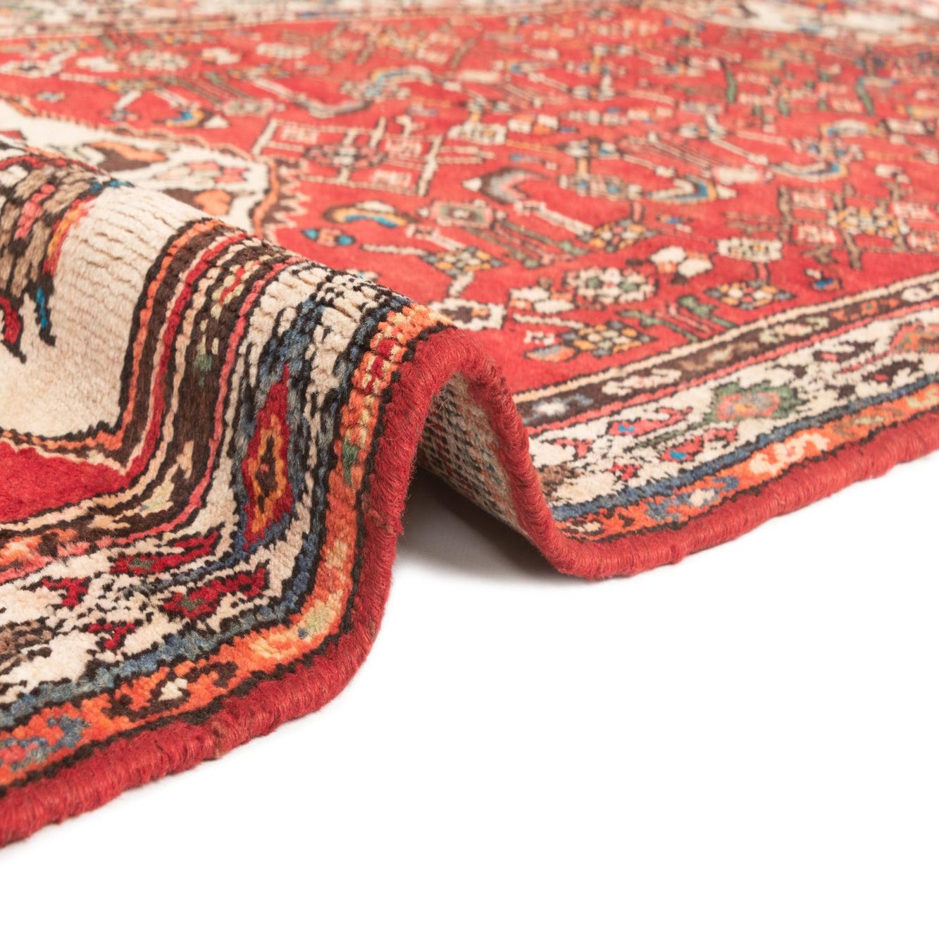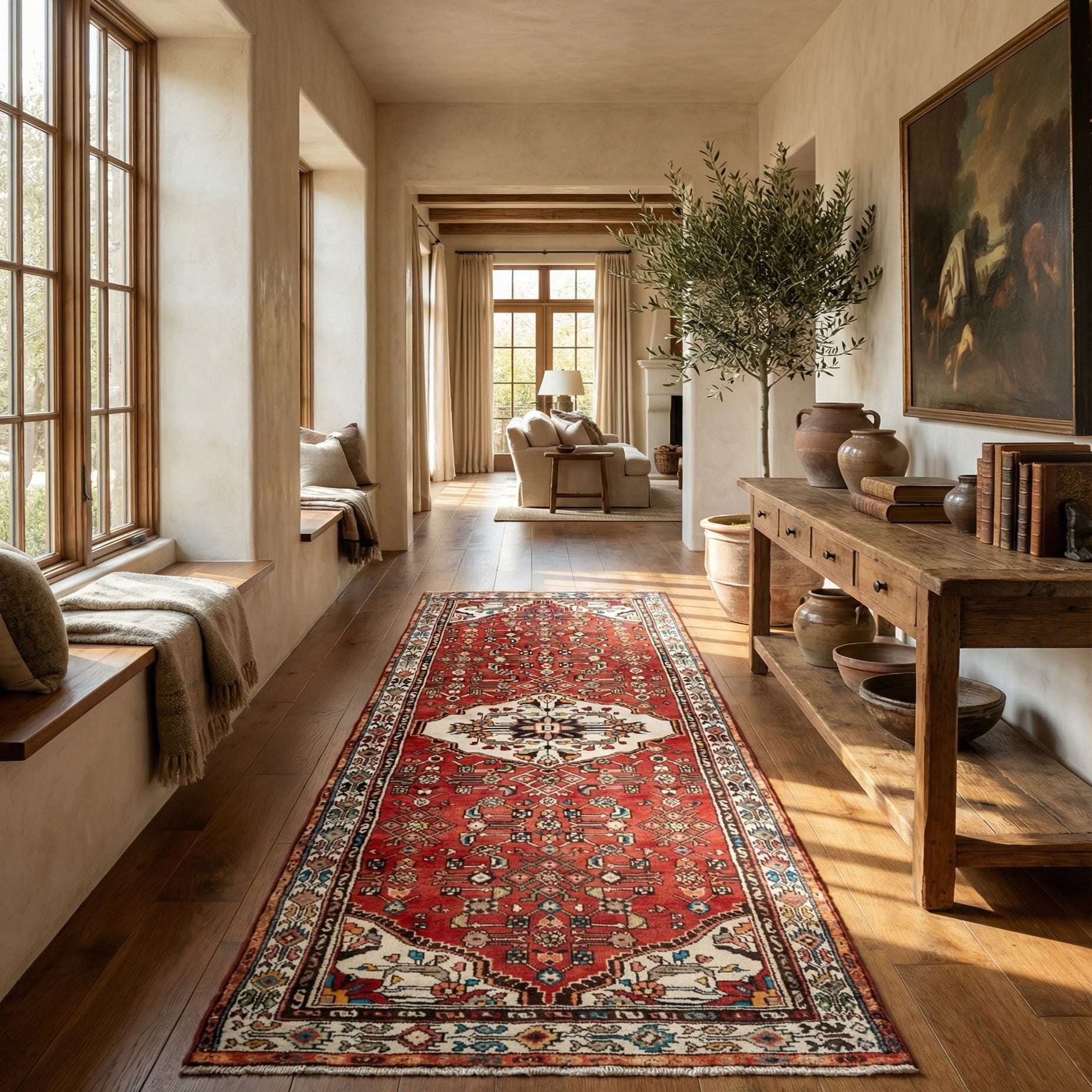 A handmade 10 ft Hamedan wool runner rug in red with a tribal, traditional pattern, ideal for hallways.