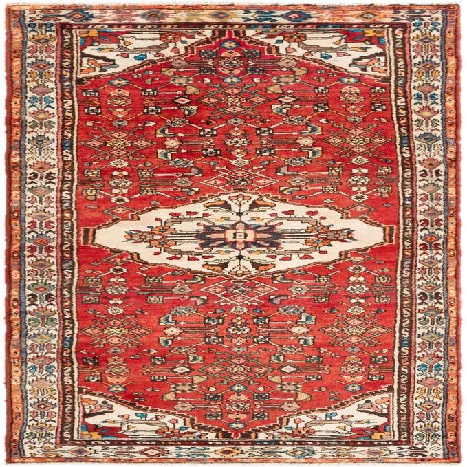 Primary color is Red. Colors in this rug include: Red, Cream, Brown, Orange, Green, Blue.