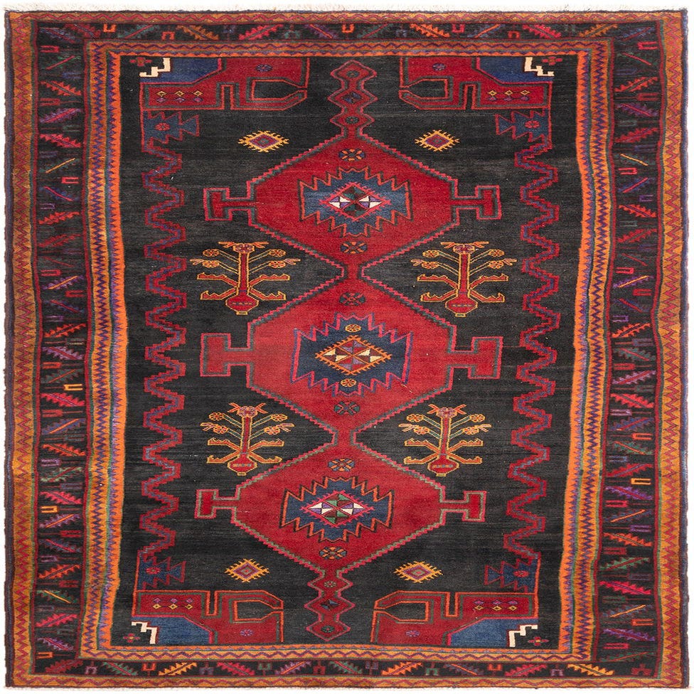 A 10 ft Hamedan runner rug in red and black, featuring traditional tribal patterns and a medium pile.