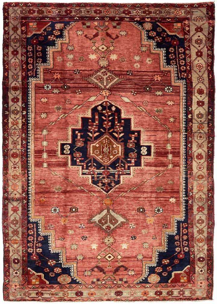 Primary color is Red. Colors in this rug include: Red, Gray, Ivory, Light Brown, Navy Blue, Orange, Peach, Olive.