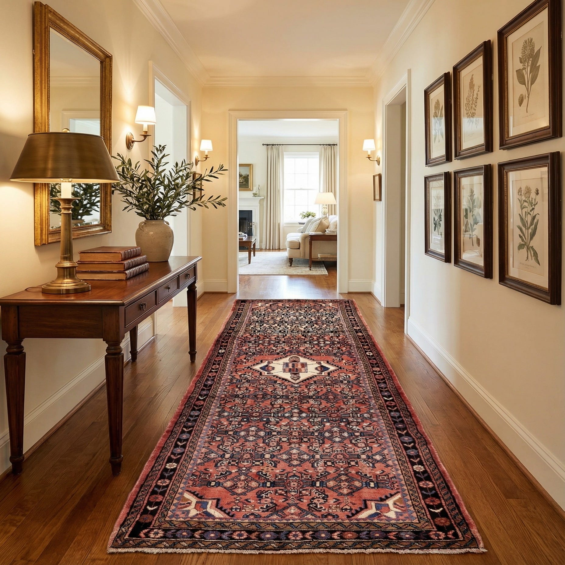 A 10 Ft runner rug featuring a rich red field with intricate tribal and Persian patterns in navy, cream, and brown, ideal for a hallway.