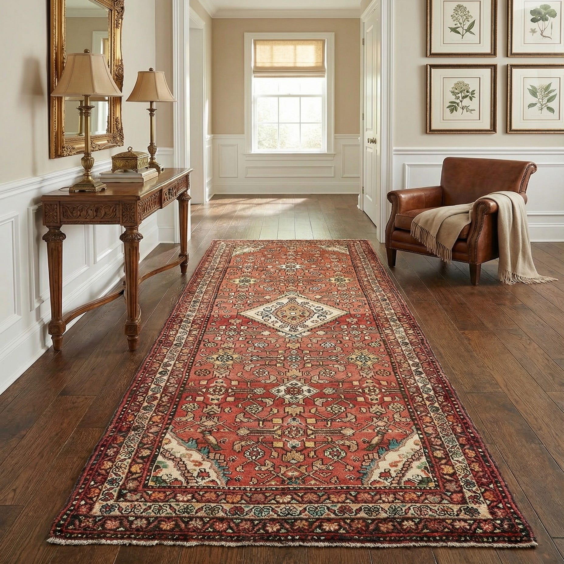 A 10 Ft runner rug in red with a central medallion and intricate botanical and tribal patterns, ideal for a hallway.