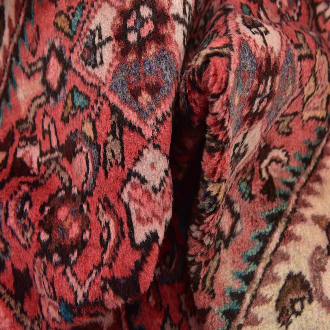 The rug is finished with fringe details that add an authentic touch, respecting its heritage and craftsmanship. Given its textural depth and traditional design, this runner would be particularly apt in spaces favoring classic, rustic, or vintage decor. It would serve well in a hallway, offering a warm invitation into the home, or underpinning a long dining table in a more formal setting. In environments with neutral tones or rich wooden furnishings, this Hossainabad runner will anchor the space and act as a focal point, bringing warmth and sophistication.
