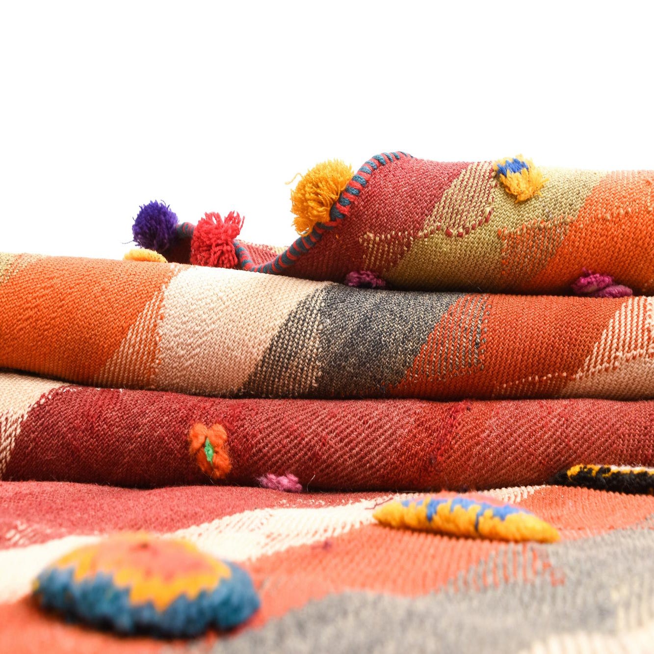 A vibrant 10 Ft Jajim runner rug with red, orange, cream, and green stripes, featuring colorful pom-poms along the edges.