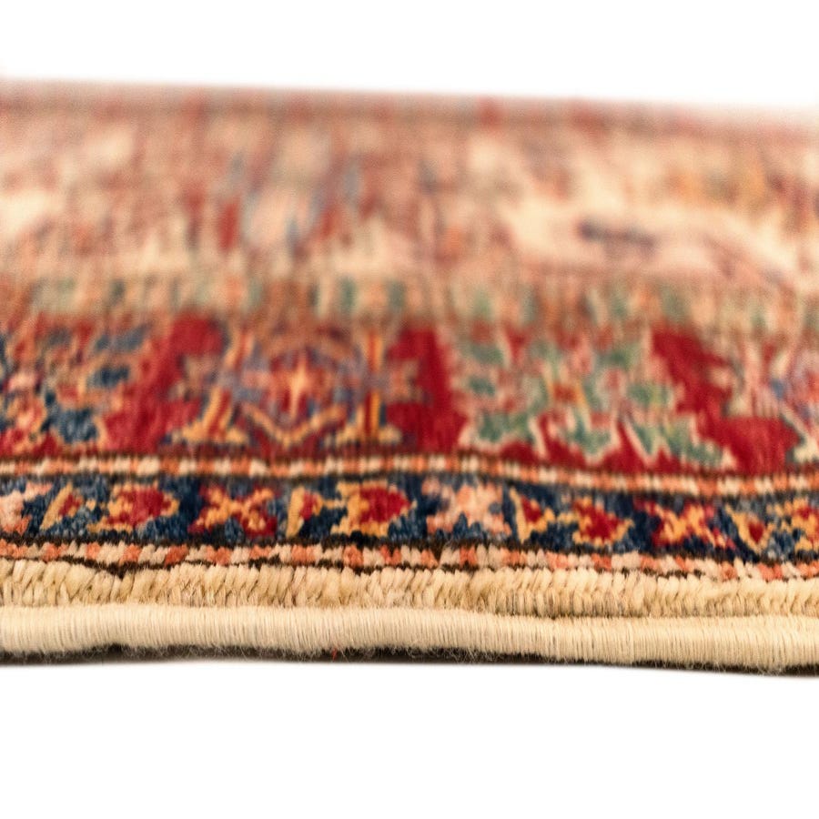 A 10 ft runner rug in a traditional Persian style, featuring a cream field with intricate geometric patterns in red, blue, green, and orange, framed by a rich red border.