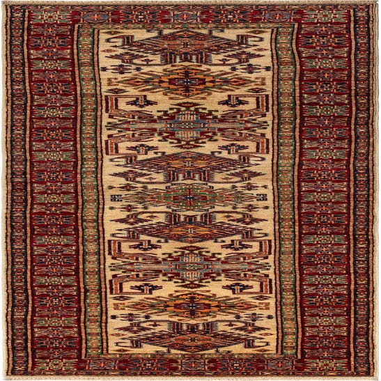 This Kazak collection 10 Ft Runner rug is a handcrafted testament to timeless design, featuring a bold red background that anchors its stylistic geometric patterns. Artfully composed of 100% wool, it showcases a series of intricate motifs in harmonious shades of beige and brown, creating a distinctive and cohesive composition. The rich texture of the weave contributes to the rug's authentic appeal, while the substantial body of wool offers a tactile comfort underfoot.