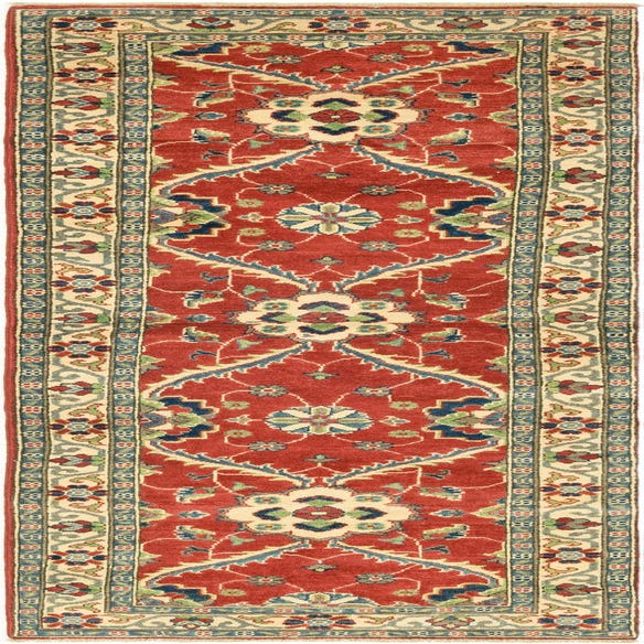 Primary color is Red. Colors in this rug include: Red, Blue, Brown, Cream, Green, Navy Blue.