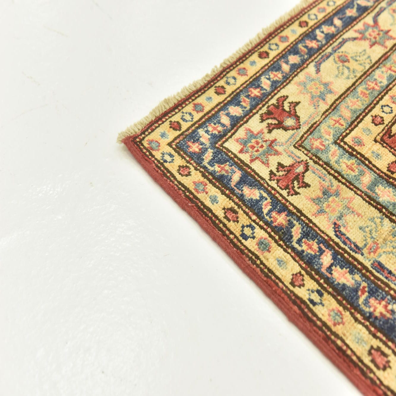 The Kazak Hand Knotted 10 Ft Runner is crafted from 100% hand-spun wool, showcasing a rich melange of colors, including Red, Blue, Brown, Green, Navy Blue, Yellow, and Orange, with the predominant background color being Red. The design features a series of traditional geometric motifs, symmetrically aligned along its length, creating a well-ordered and harmonious visual experience. The border presents a detailed pattern, flanked by narrower guard borders, which frames the central design elements and complements the overall aesthetics of the rug.