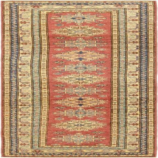 Primary color is Red. Colors in this rug include: Red, Blue, Brown, Green, Navy Blue, Yellow, Orange.