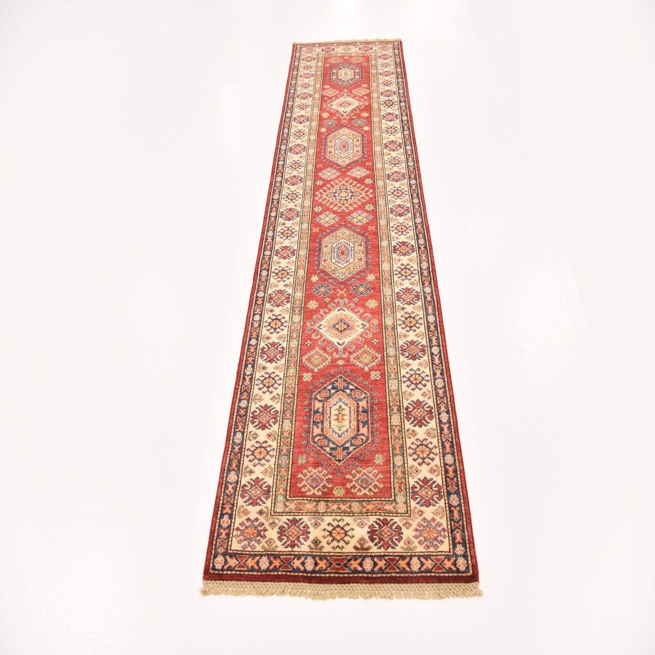 This Kazak collection runner offers a traditional design with a rich palette that includes shades of red, black, blue, brown, green, navy blue, ivory, and salmon, set on a red background that anchors the piece with warmth. The rug measures 10 feet in length, ideal for hallways or long narrow spaces, and features a distinctive pattern of geometric motifs and medallions, reminiscent of classic folk artistry.