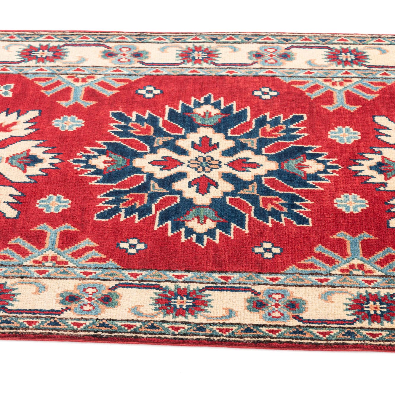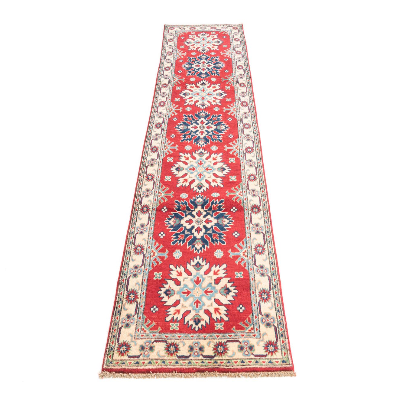 This Kazak collection rug is a 10 Ft runner hand-knotted from 100% hand-spun wool, offering a substantial and resilient texture. It features a dominant red background, adorned with rich colors such as blue, brown, cream, gold, green, and navy blue which create its intricate pattern.