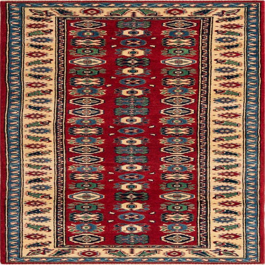 Primary color is Red. Colors in this rug include: Red, Beige, Blue, Brown, Navy Blue, Green.