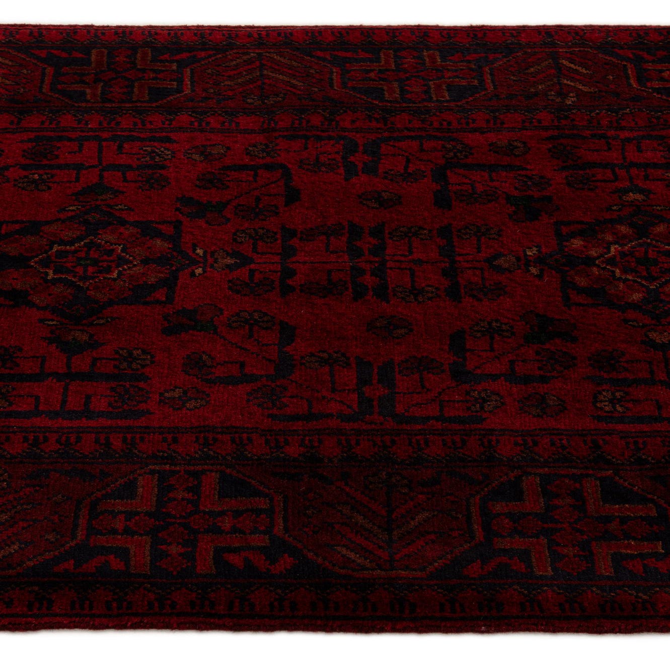 A 10 ft Khal Mohammadi runner rug in deep red with intricate dark oriental patterns, perfect for a hallway.