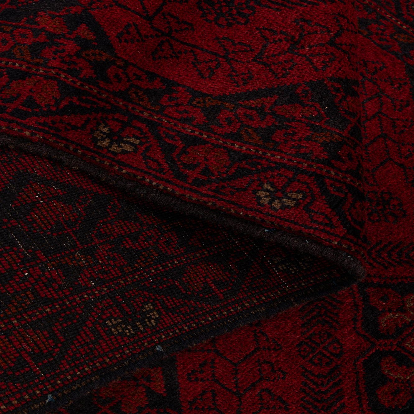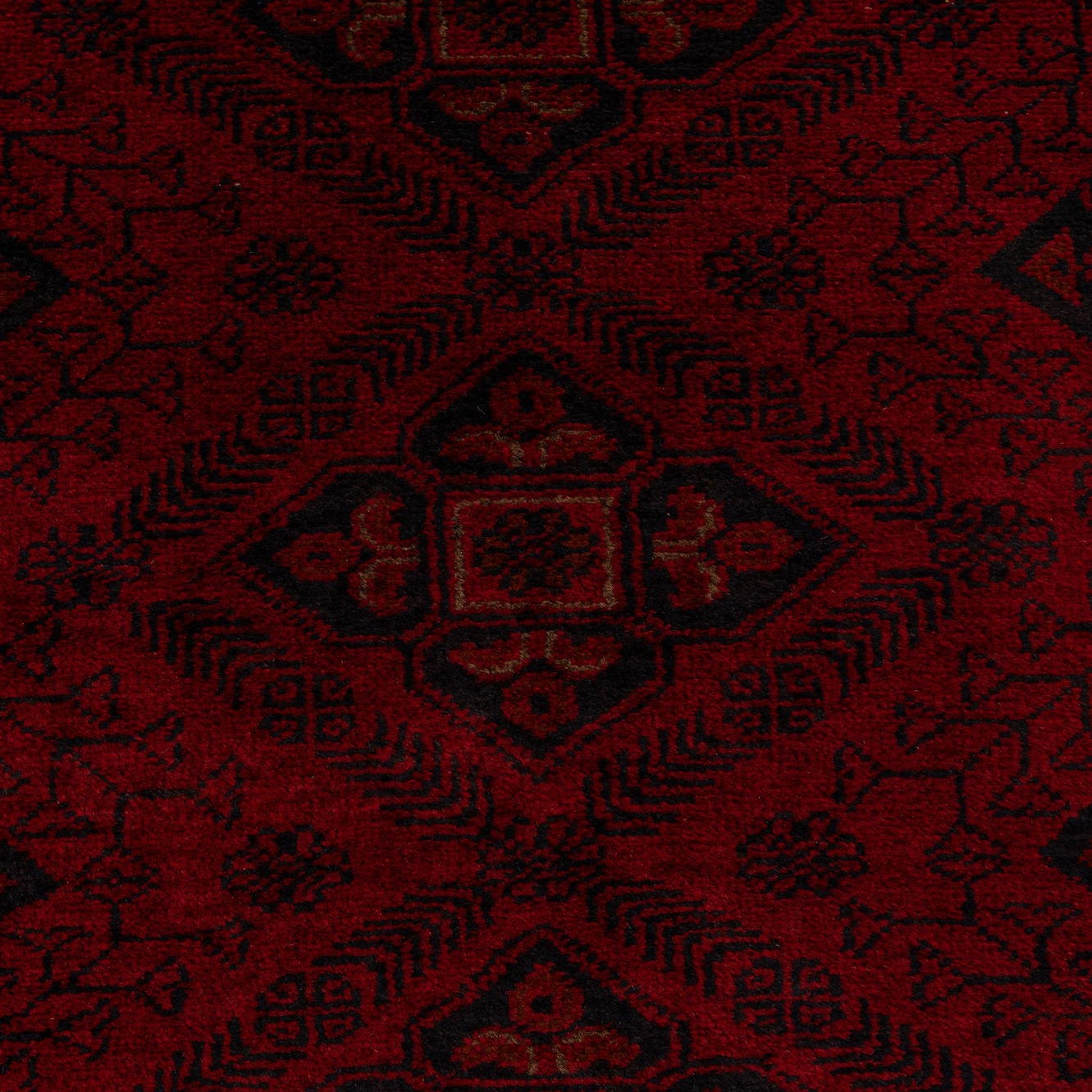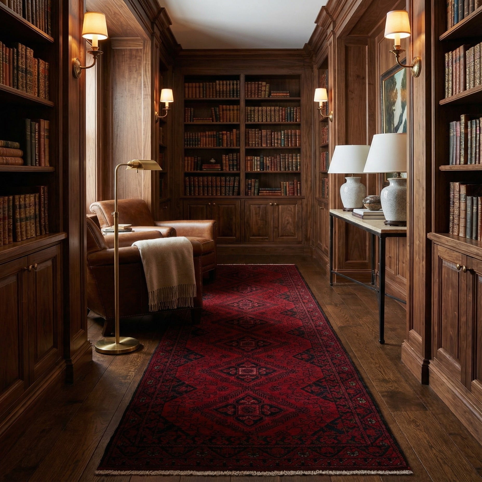 A 10 ft Khal Mohammadi runner rug in deep red with intricate black Oriental patterns, ideal for a hallway.
