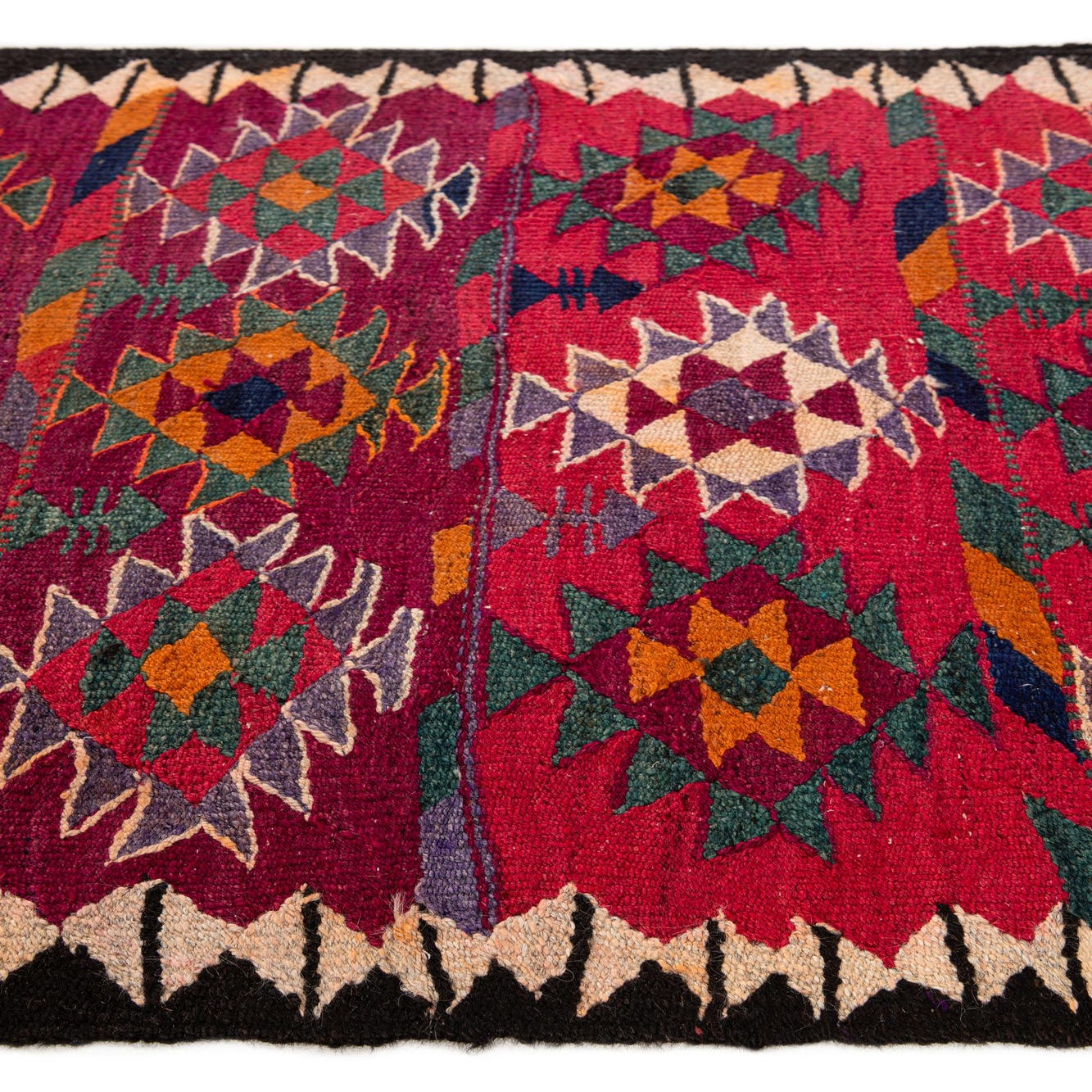 A 10 Ft Kilim Fars runner rug with a vibrant red background and colorful tribal geometric patterns, ideal for a hallway.