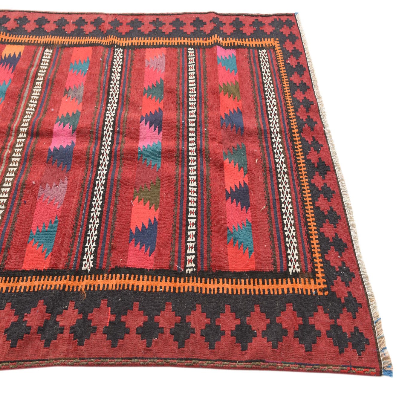 The texture of the rug is inherently flatweave, typical of traditional Kilim rugs, resulting in a low pile that is both durable and easy to maintain. The rug's edges are complemented by fringe detailing, giving it an authentic, handcrafted appearance.