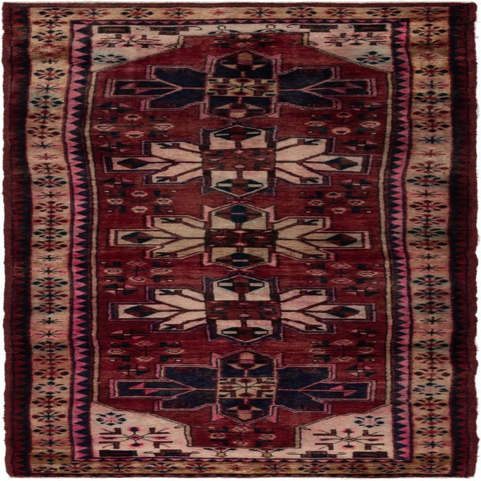 Primary color is Red. Colors in this rug include: Red, Beige, Green, Ivory, Navy Blue, Pink, Black.