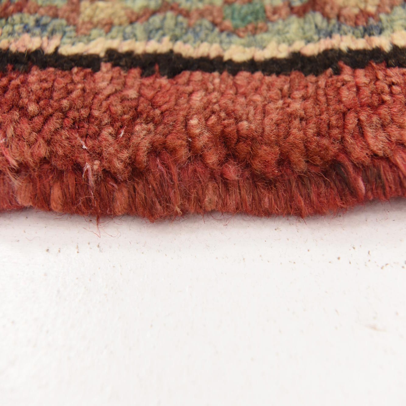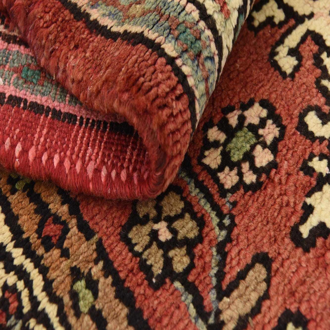 The rug exhibits a plush and inviting texture typical of high-quality wool, with a detailed pattern that reflects the artisanal skill. The inclusion of fringe edges adds to the authentic character of the rug. Owing to its age, the rug demonstrates a gentle patina that contributes to its unique charm and character.