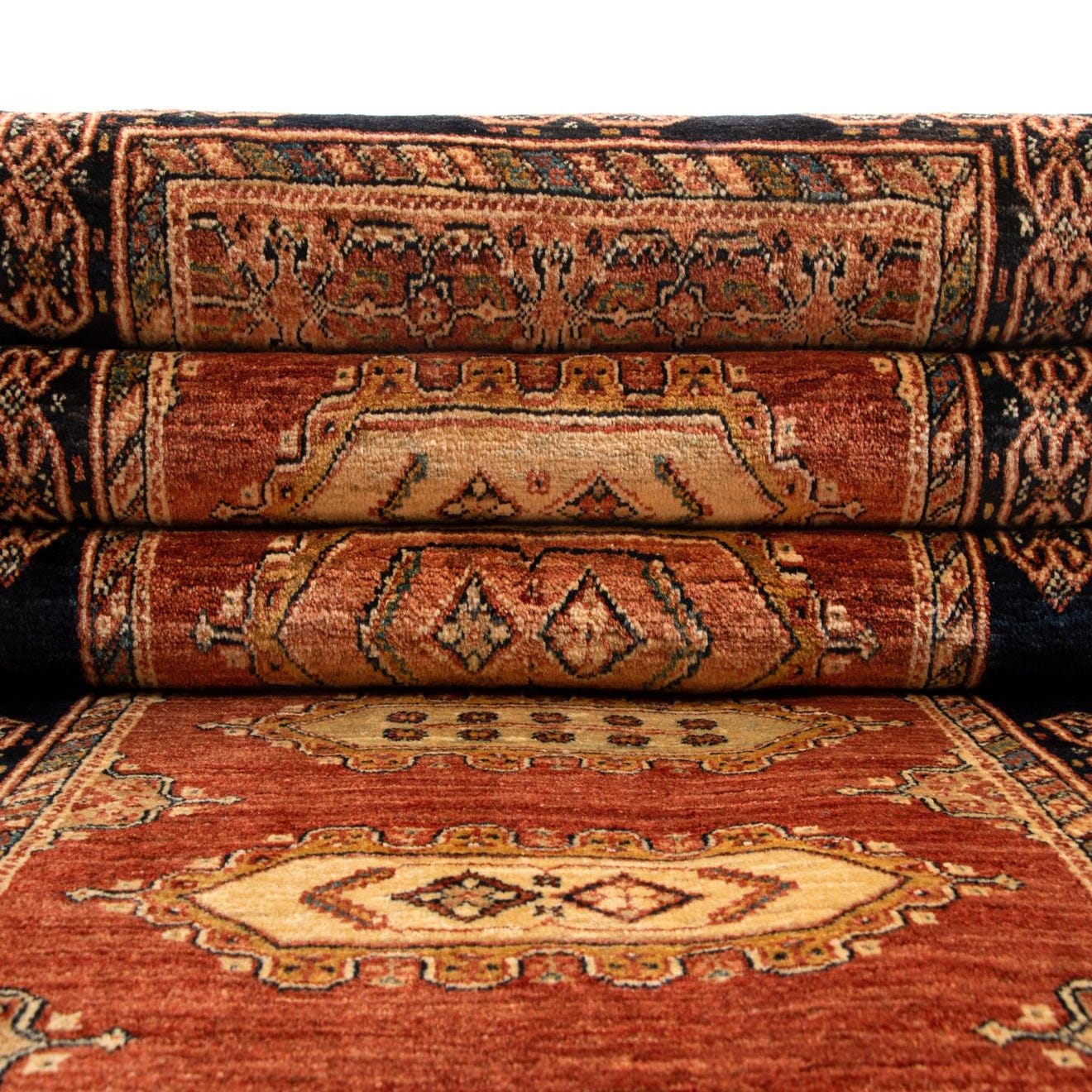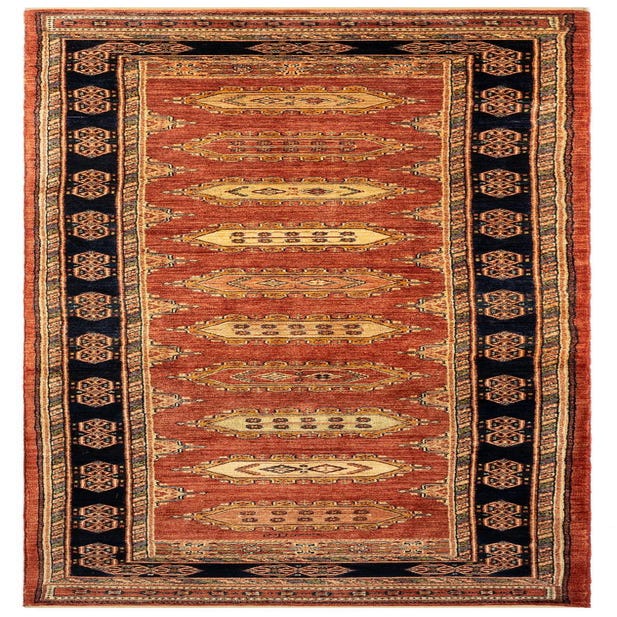 A warm red field anchors a classic tribal medallion layout, with a repeated row of elongated octagonal medallions in yellow and orange running the length of the runner. Narrow guard borders and a contrasting dark blue outer border frame the composition, the navy bands punctuated by small geometric motifs that add rhythm and visual balance. Hand made of 100% wool, the pile has a dense, soft hand with a subtle, natural luster and a slightly varied surface that enhances the depth of the rich reds, warm oranges and golden yellows.