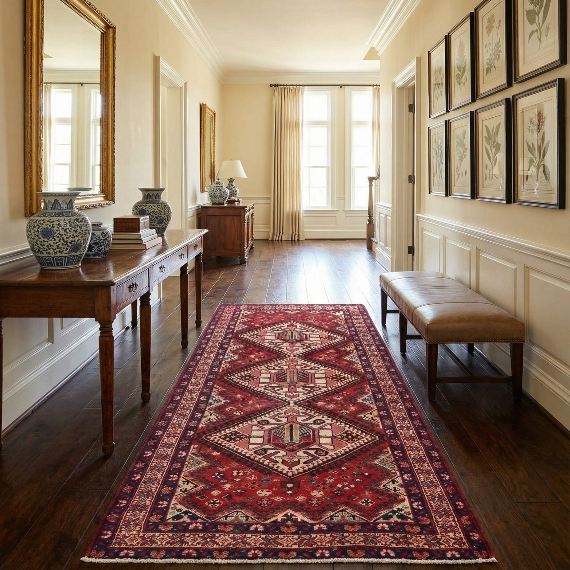 This runner would sit well in a variety of interior styles, particularly those that celebrate classic and vintage decors, such as traditional, eclectic, and global-inspired spaces. It can serve as a defining piece in an entryway, illuminate a narrow hallway, or add warmth and historical charm to a living area or kitchen. The piece’s depth of color and timeless design make it adaptable to both casual and formal settings.