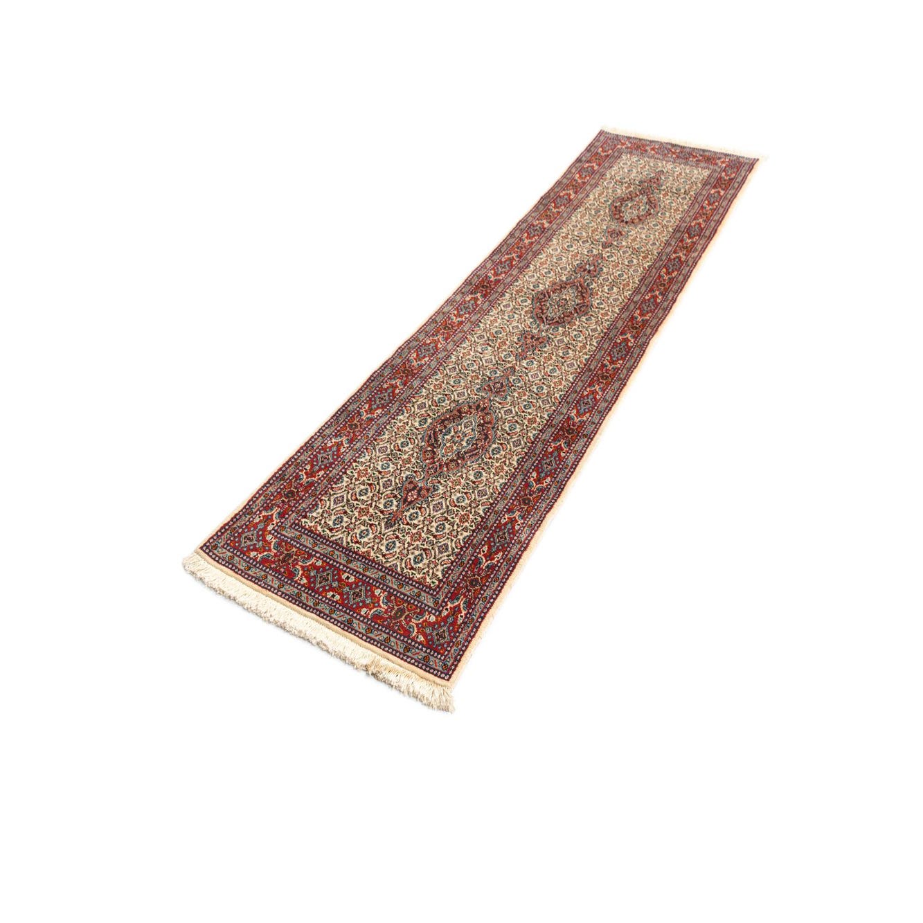 A 10 Ft Mood Collection Persian runner rug in reds and cream, featuring intricate floral and medallion patterns, perfect for a hallway.