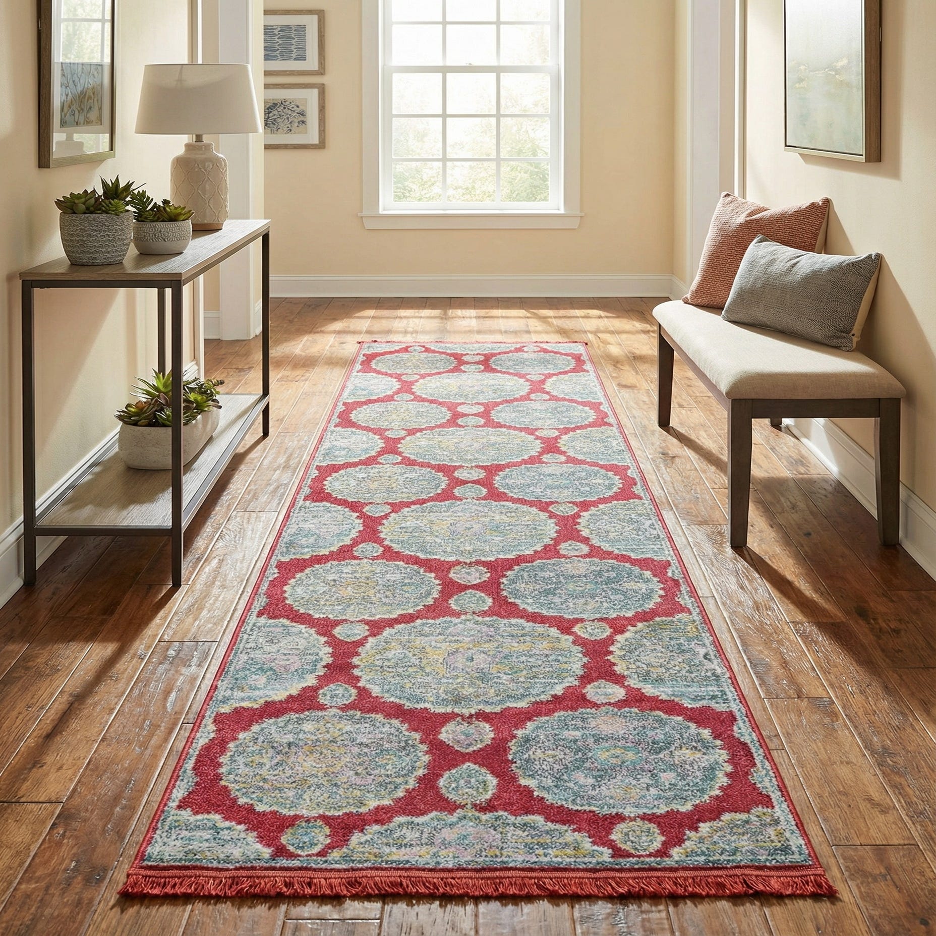 Bold red forms the backdrop for a classic medallion repeat rendered in soft, varied tones of blue, ivory, green, gray, yellow and pink. Each circular medallion carries a gently distressed, painterly texture that softens the contrast against the red field, while teardrop-shaped accents between the rounds add rhythm and visual interest. A narrow border and short fringe at each end frame the composition, giving the runner a finished, slightly vintage-inspired look that blends traditional motifs with a modern color sensibility.