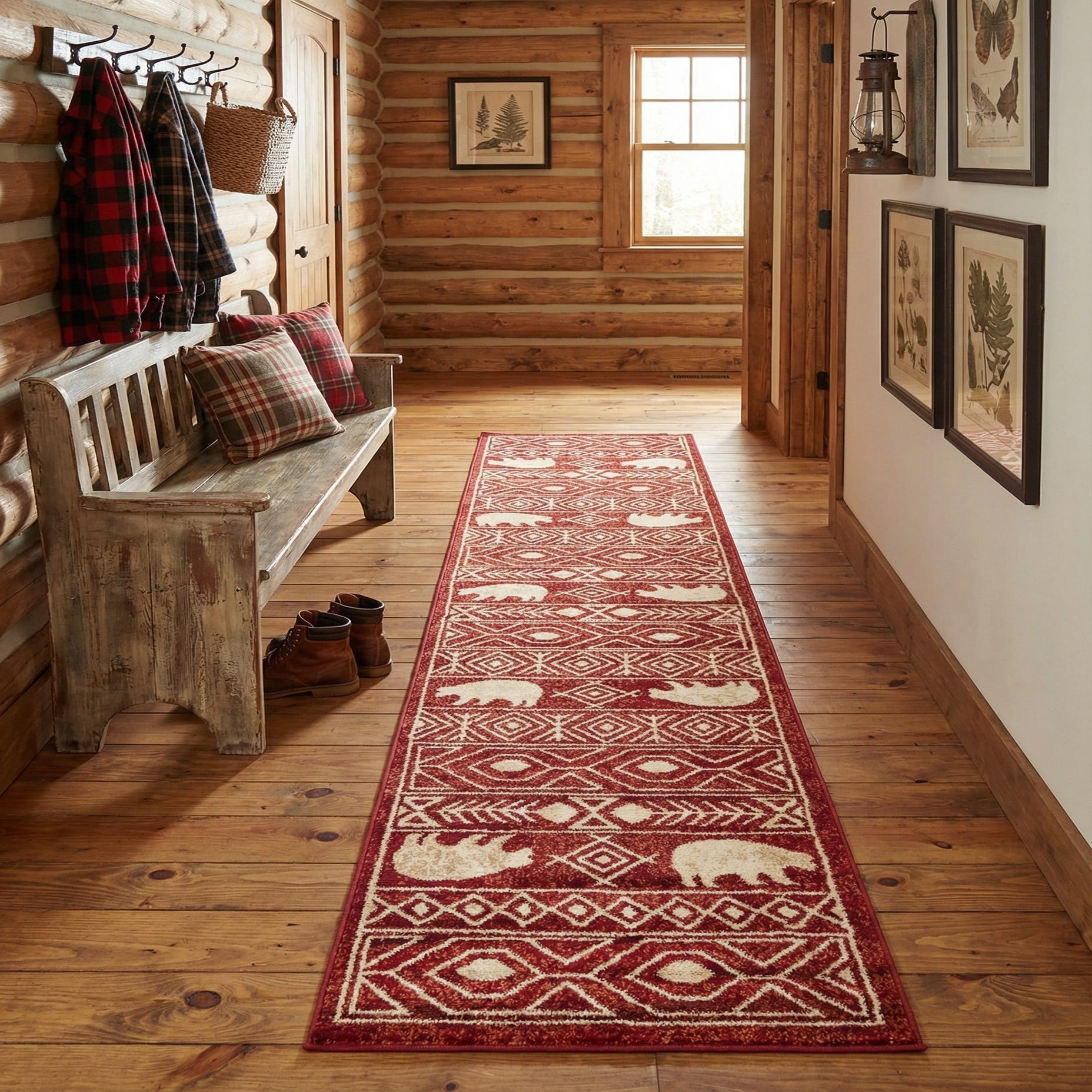 A 10 ft red runner rug with a rustic tribal pattern featuring cream-colored bears and geometric stripes, ideal for a hallway.