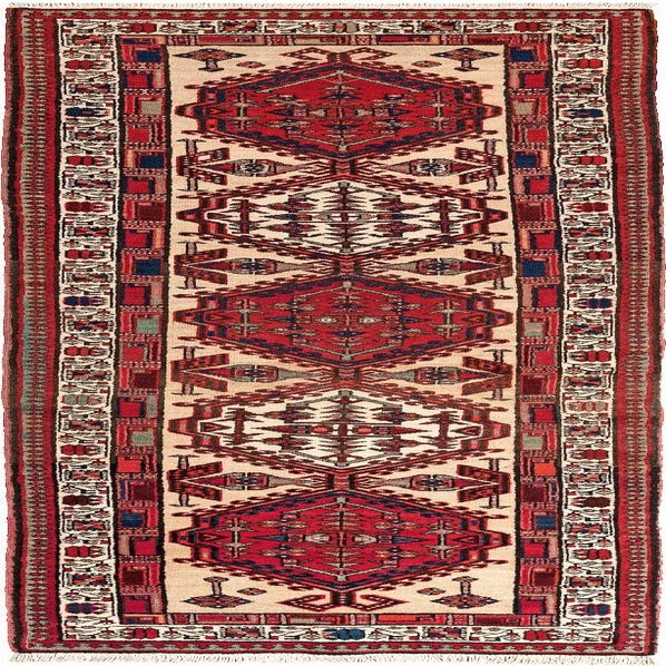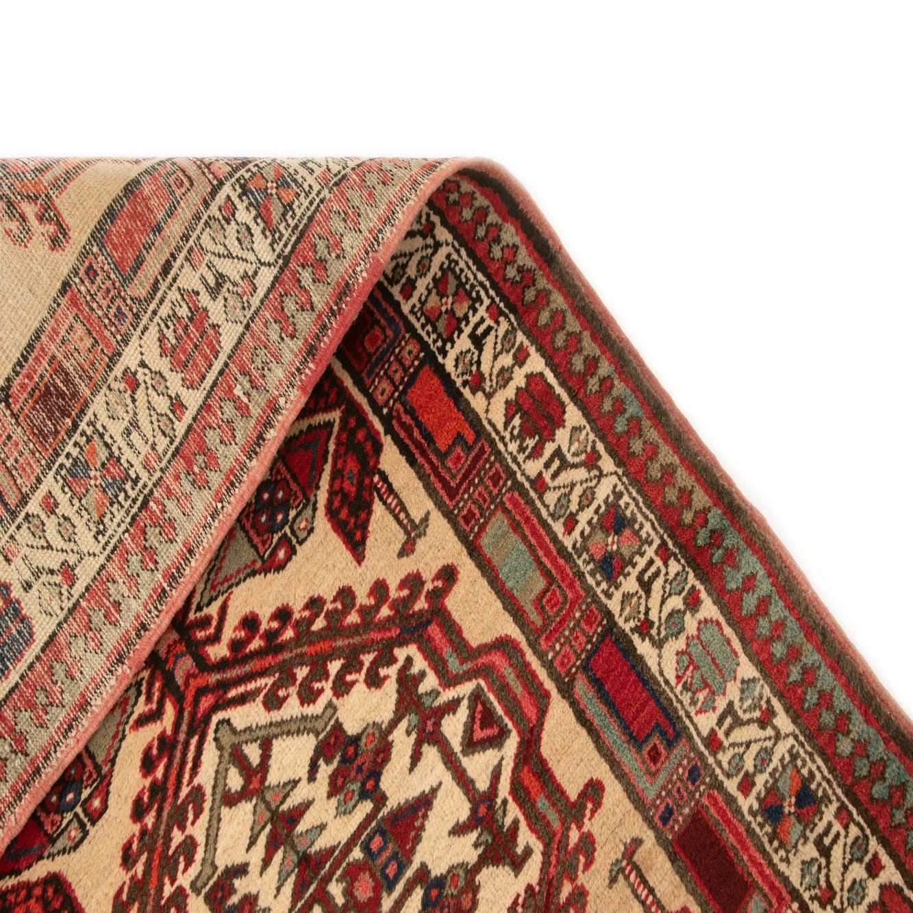 A 10 ft red and cream runner rug with intricate geometric patterns, perfect for a hallway.