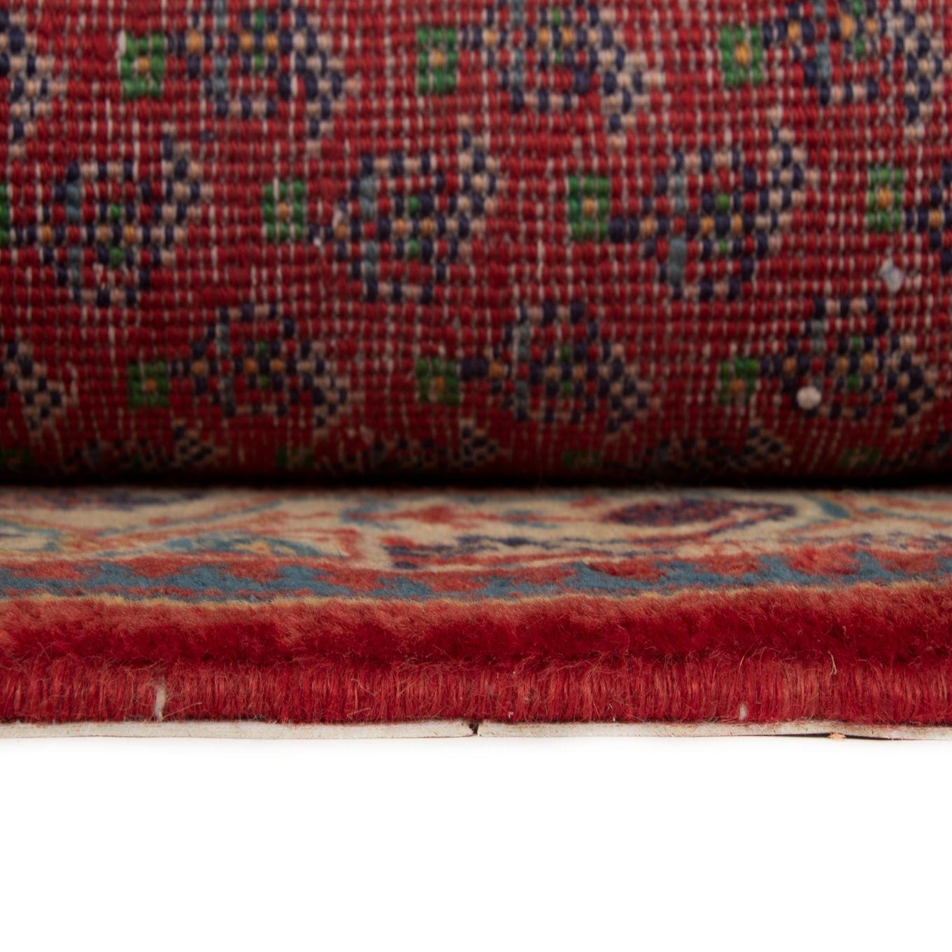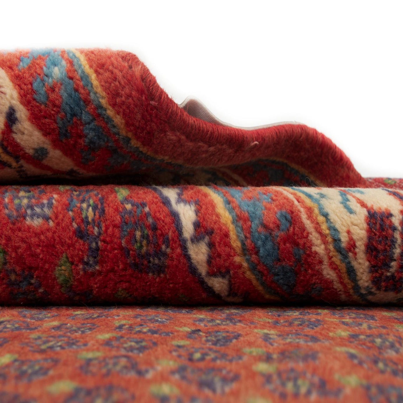 The Sarough Mir 10 Ft Runner is a testament to traditional craftsmanship, hand-knotted from 100% wool to offer a durable and plush underfoot experience. It exhibits a rich red background, imbued with a detailed pattern comprising hues of blue, green, beige, and grey. The intricate border showcases a complementary color palette, adding depth and symmetry to the overall design.