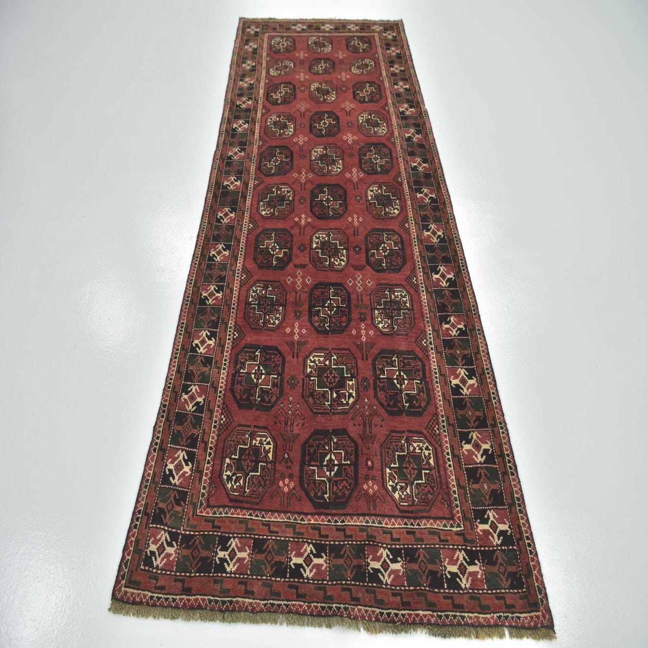 A 10 Ft runner rug in deep red with traditional Persian and tribal patterns, featuring geometric medallions and intricate borders in black, green, and cream.