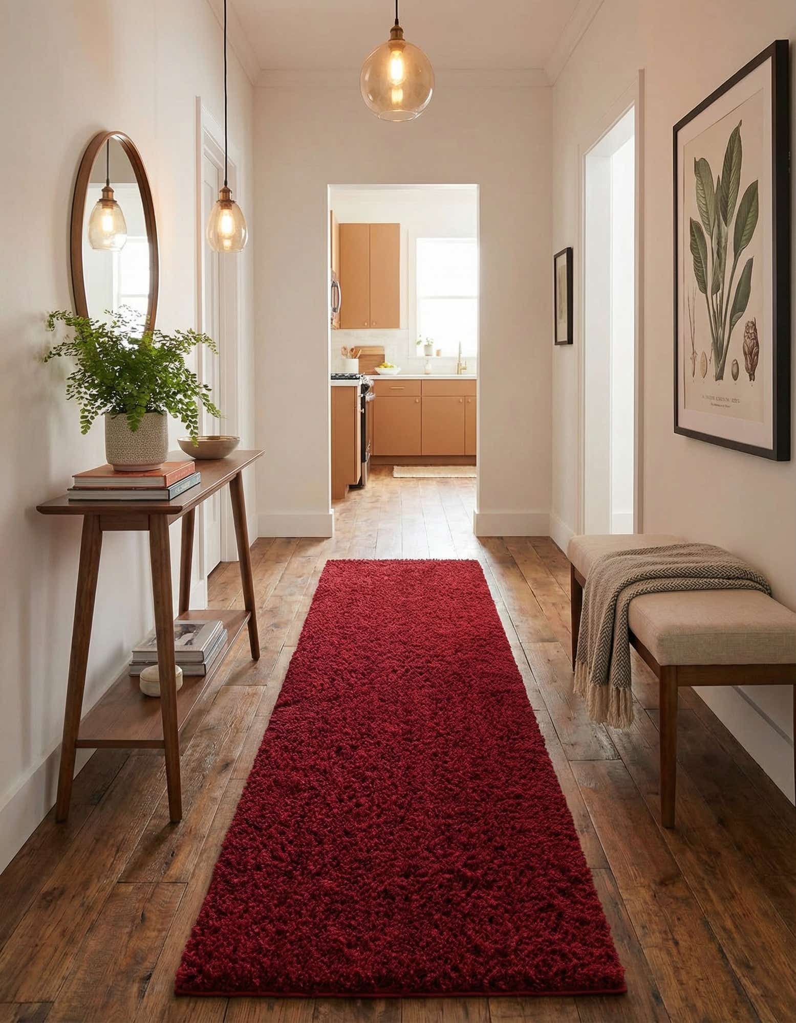 A vibrant red 10 ft runner rug with a plush shag pile, perfect for adding warmth and comfort to a hallway.