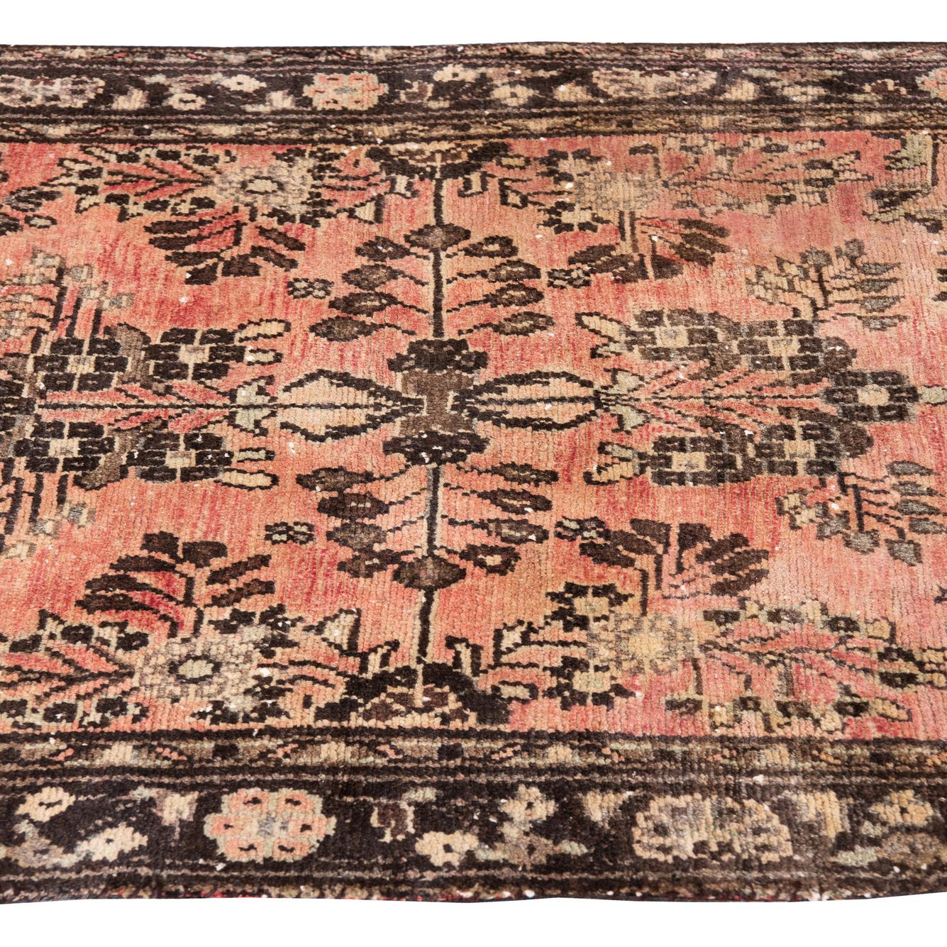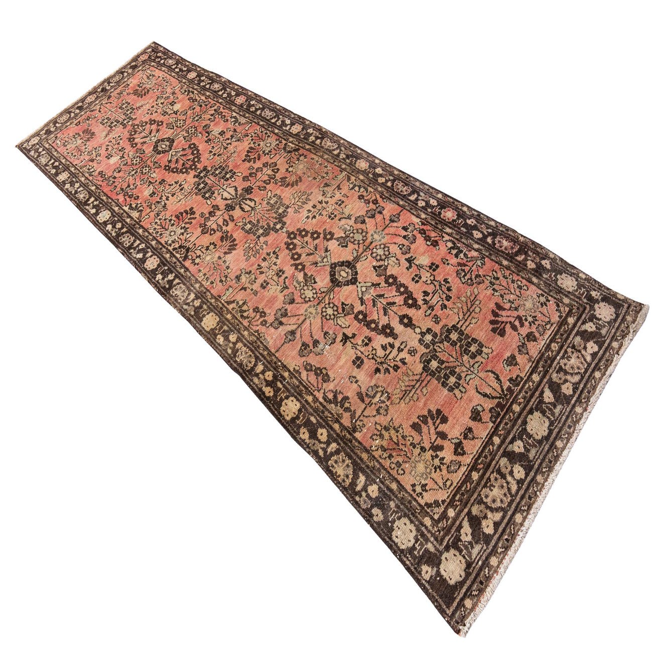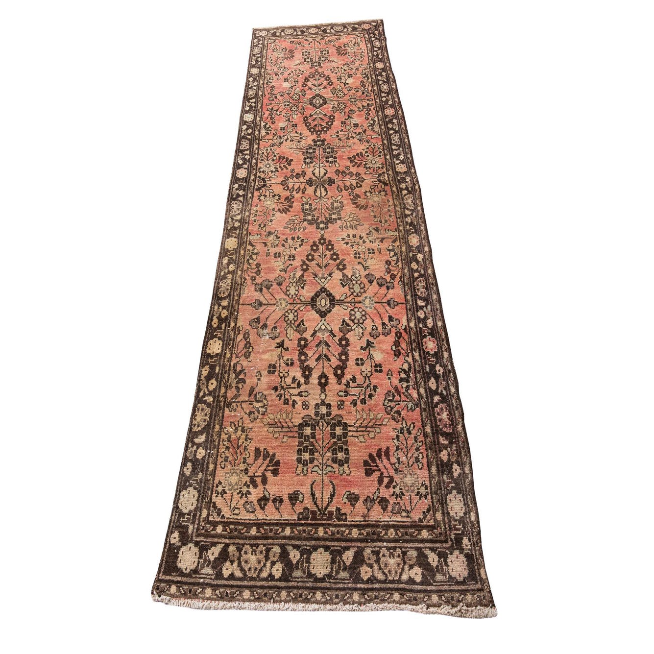A 10 Ft runner rug with a faded red background and intricate dark brown and beige Persian floral patterns, ideal for a hallway.
