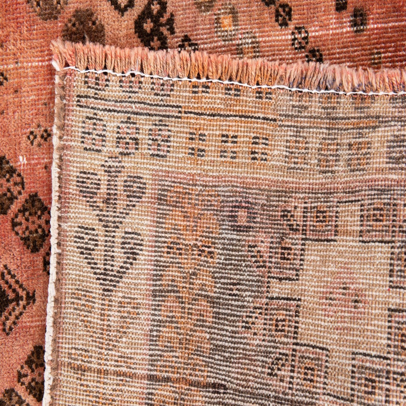 The rich texture of the wool and the intricate details of the hand-knotted weave provide both visual depth and a tangible sense of quality. Finished with a fringe that accentuates its traditional appeal, this rug is more than a floor covering; it's a piece of art that complements a variety of decor scenarios. Ideal for interiors that embrace a vintage aesthetic, the rug can also serve as a contrasting element in more modern or minimalist spaces, providing warmth and character. Similarly, its robust palette and design can stand out in an eclectically furnished room or add a coherent element to rustic and traditional decors.
