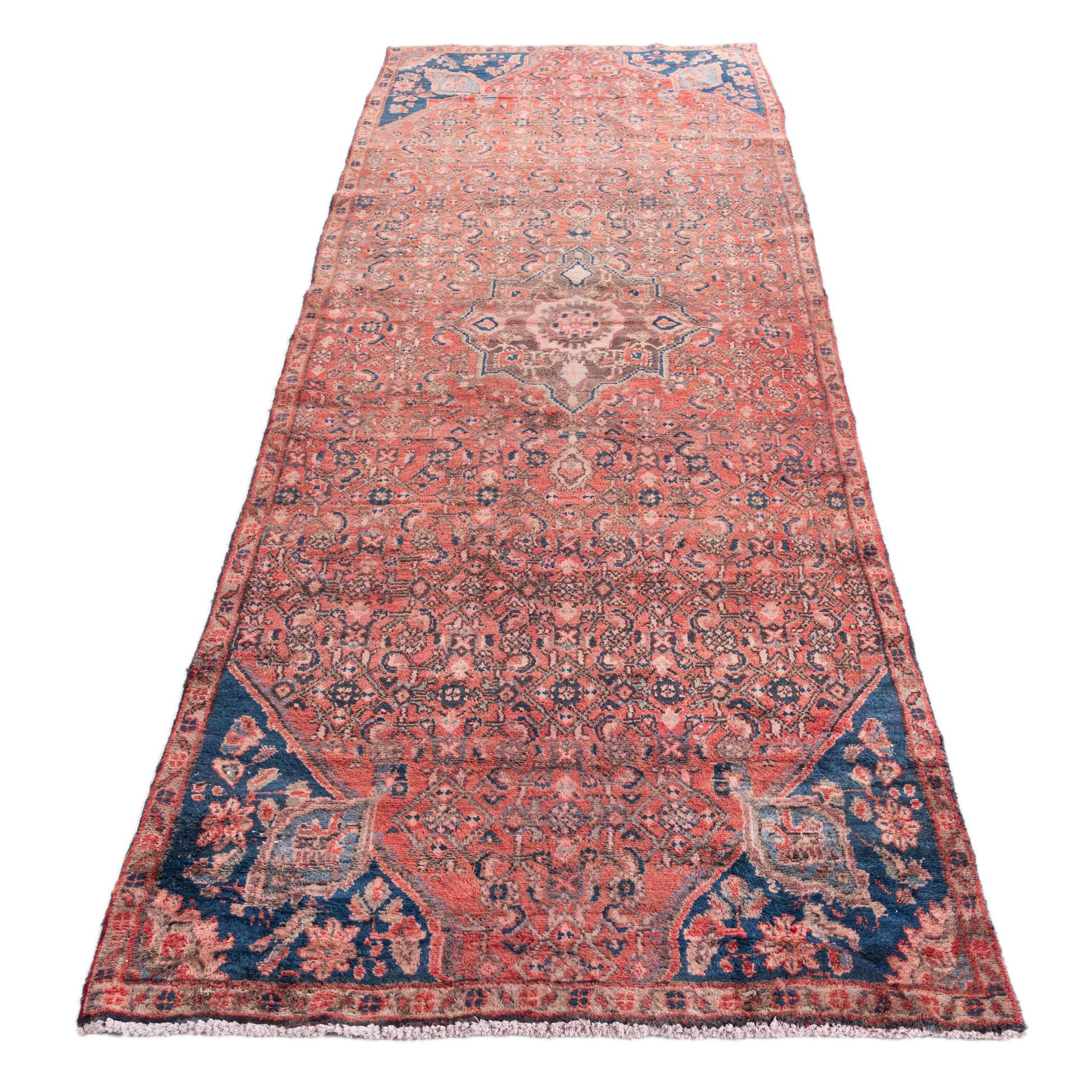 A 10 Ft runner rug featuring a faded red and blue Persian medallion pattern, ideal for a hallway.