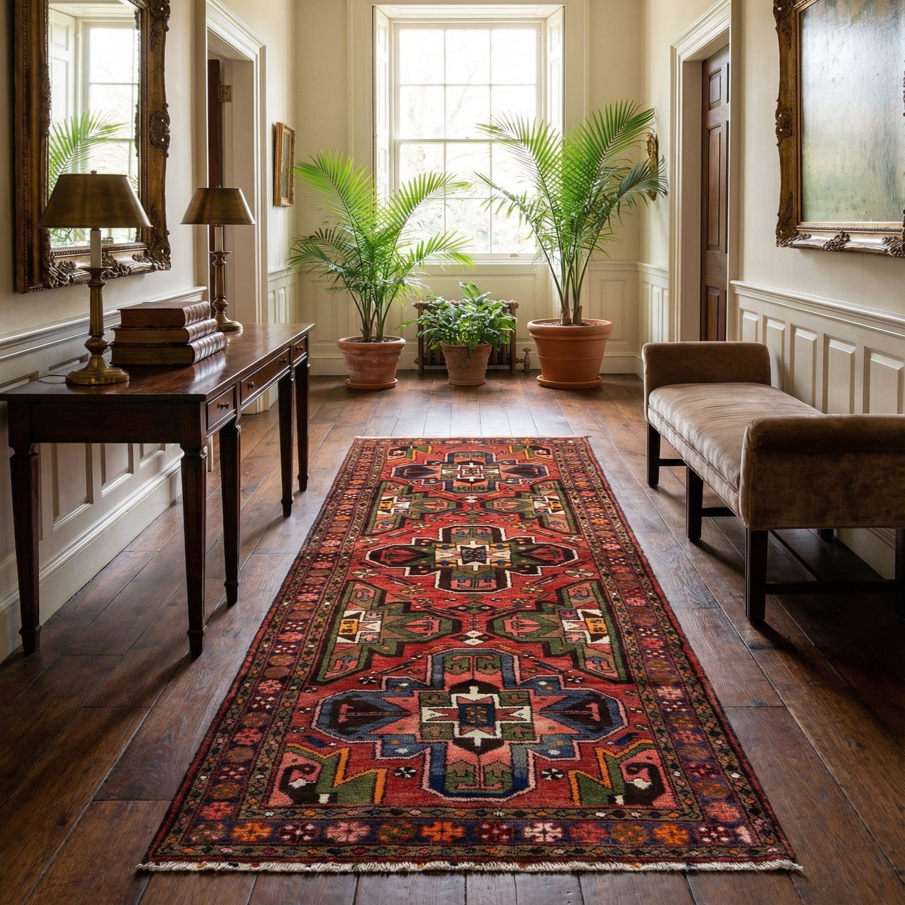 A 10 ft Zanjan runner rug featuring a tribal Persian pattern in various shades of red, green, and blue, with intricate geometric motifs and a detailed border.