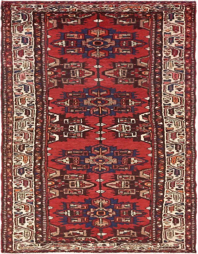 Primary color is Red. Colors in this rug include: Red, Ivory, Navy Blue, Blue, Green, Orange, Brown, Light Blue.