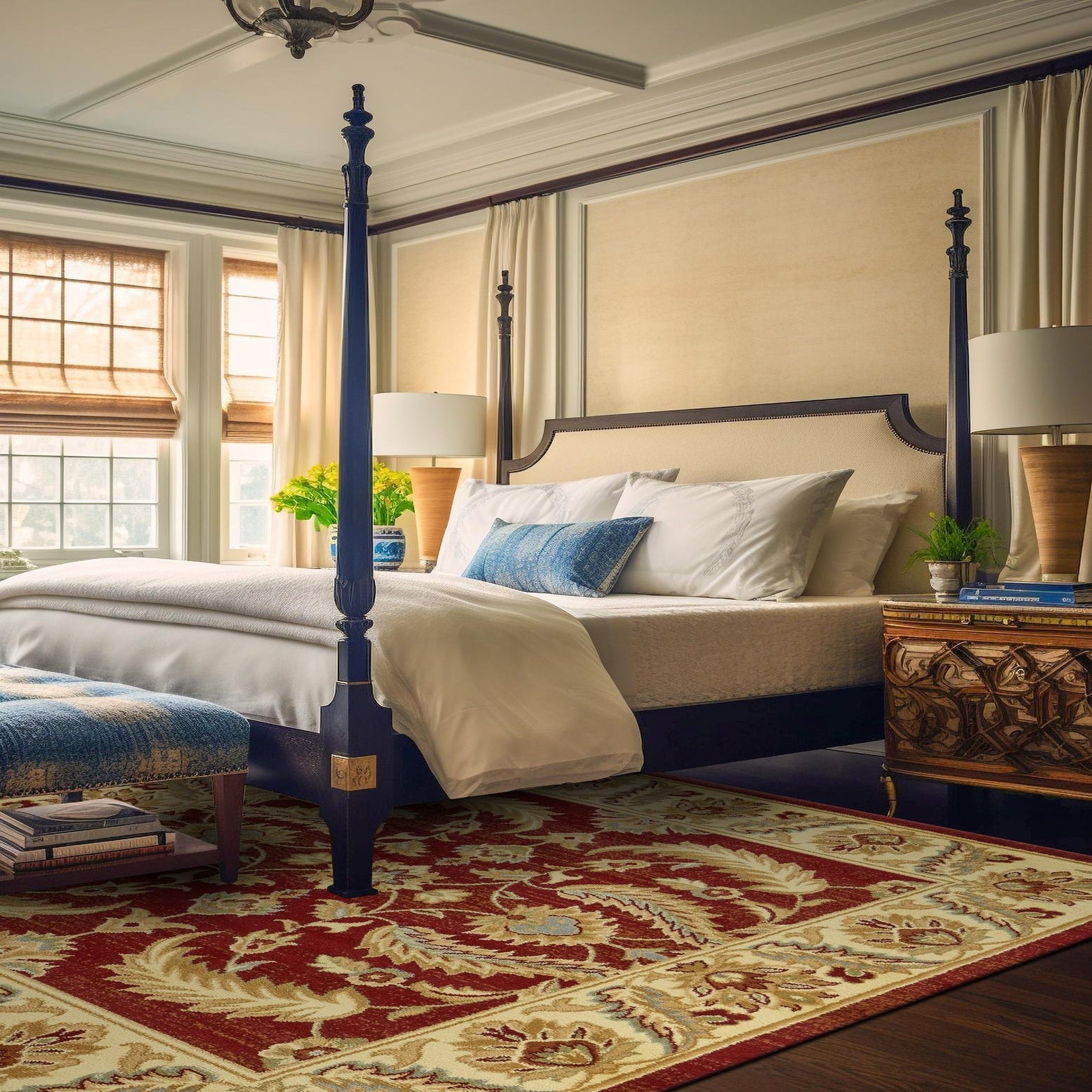 Primary color is Red. Colors in this rug include: Red, Cream, Light Blue, Light Green, Rust Red, Tan, Brown.