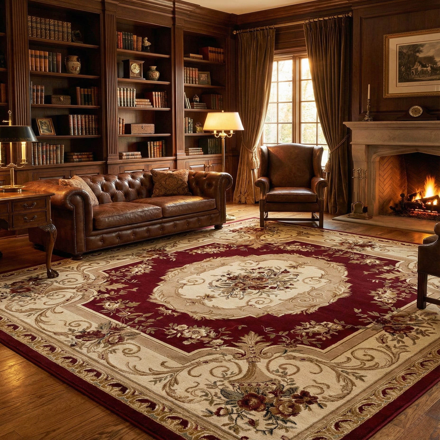 Machine-made of 100% polypropylene, the rug has a low, dense pile that feels smooth and slightly cushioned underfoot and holds the intricate pattern with crisp definition. It works well beneath a sofa grouping in a traditional living room, under a dining table to add formal warmth, or in a foyer or study alongside warm wood furniture and leather accents. The color palette pairs easily with oak or mahogany finishes, neutral upholstery, and rust- or green-toned accessories.