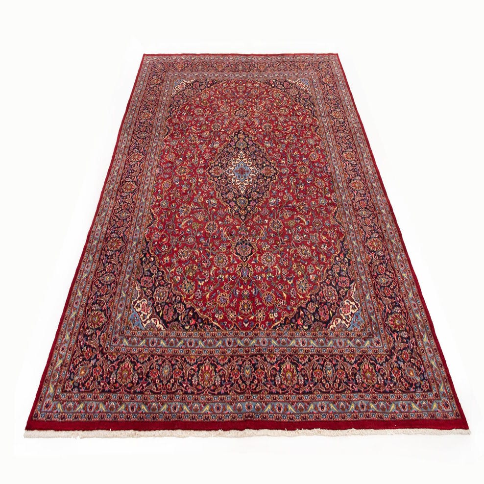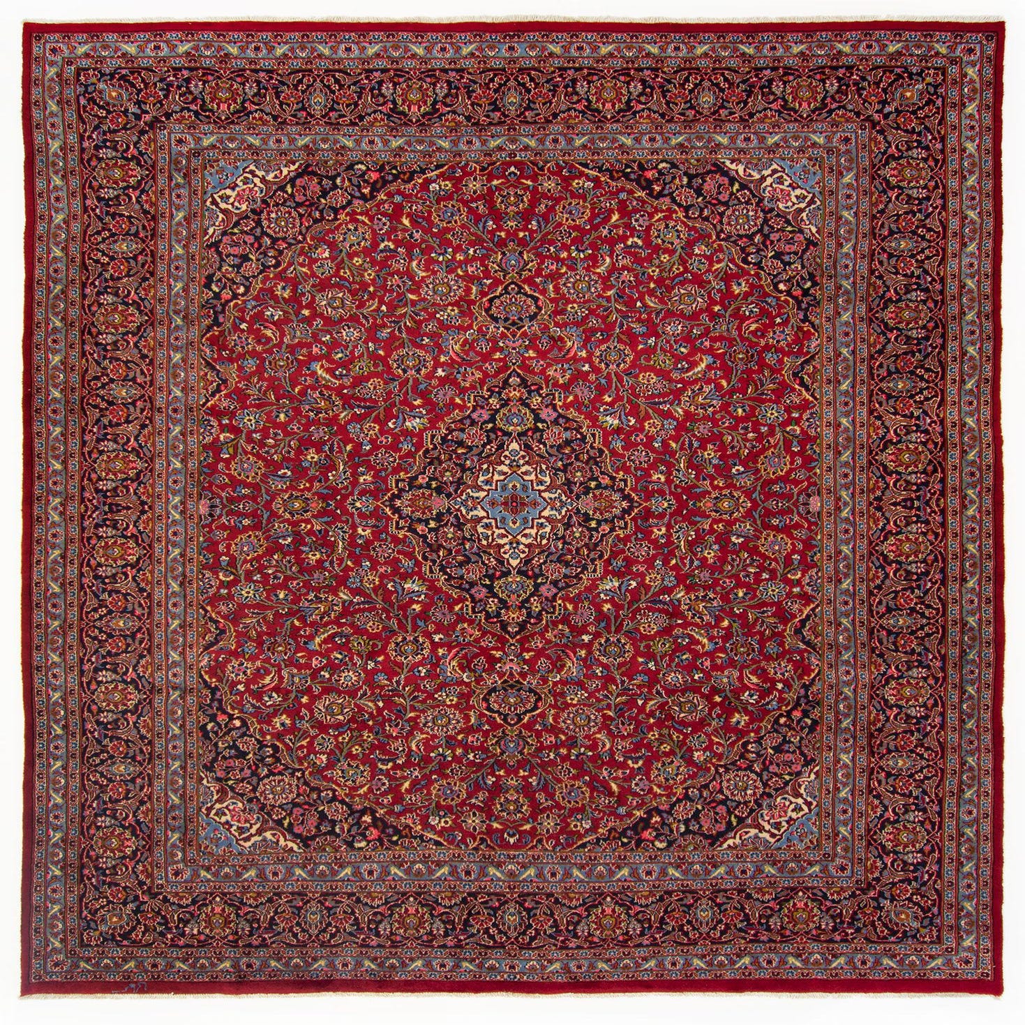 A 10x12 rectangular Kashan Persian rug in deep red with intricate floral and medallion patterns, featuring navy, gold, and light blue accents.