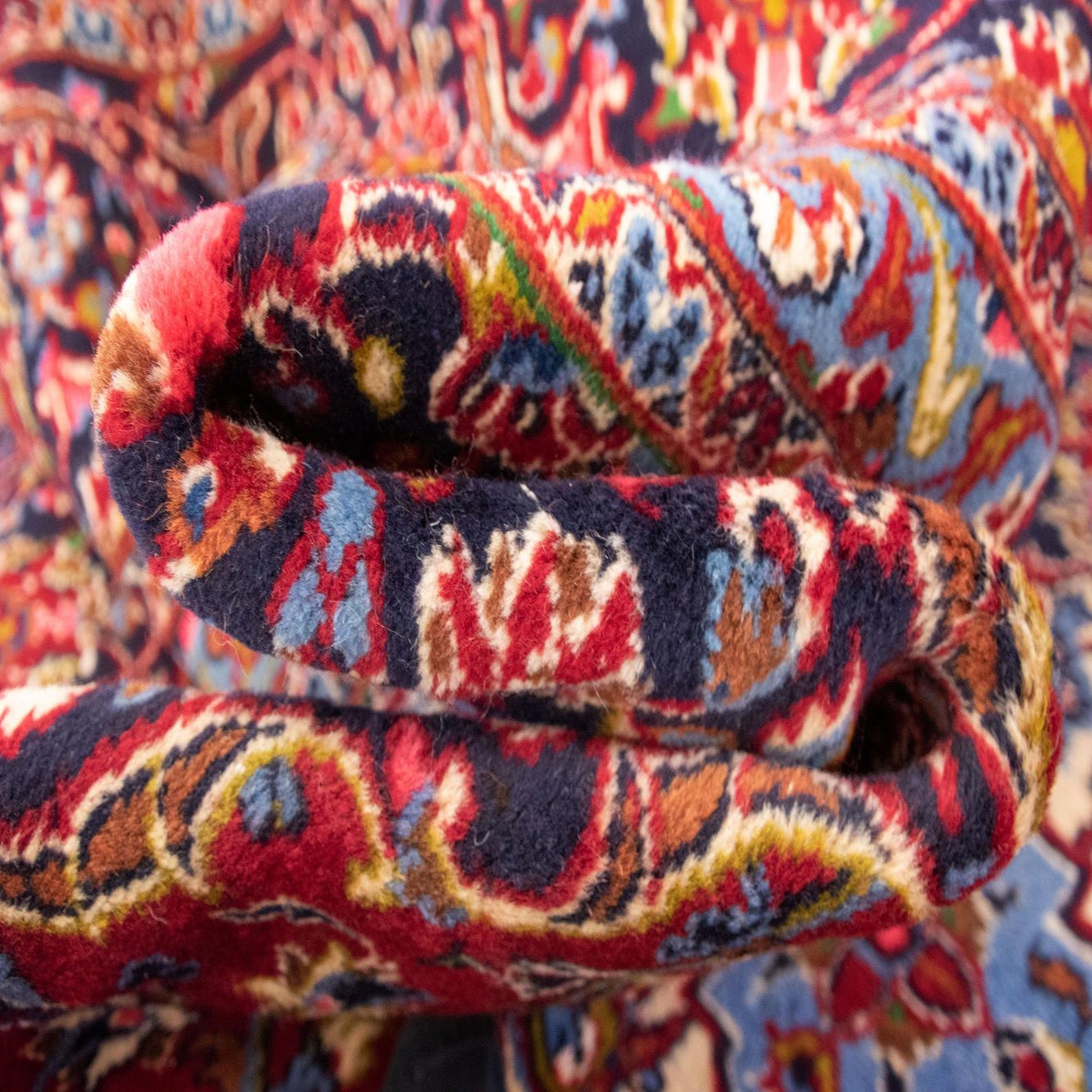 This hand-knotted Kashan collection rug features a deep red background with intricately detailed patterns in shades of blue, black, and secondary red tones. The lush field is adorned with a central medallion, echoing the rich tradition and craftsmanship of classic rug design. Flower and vine motifs flourish throughout the surface, bordered by layers of coordinating patterns and guard borders, lending a sense of formality and grandeur to the piece.